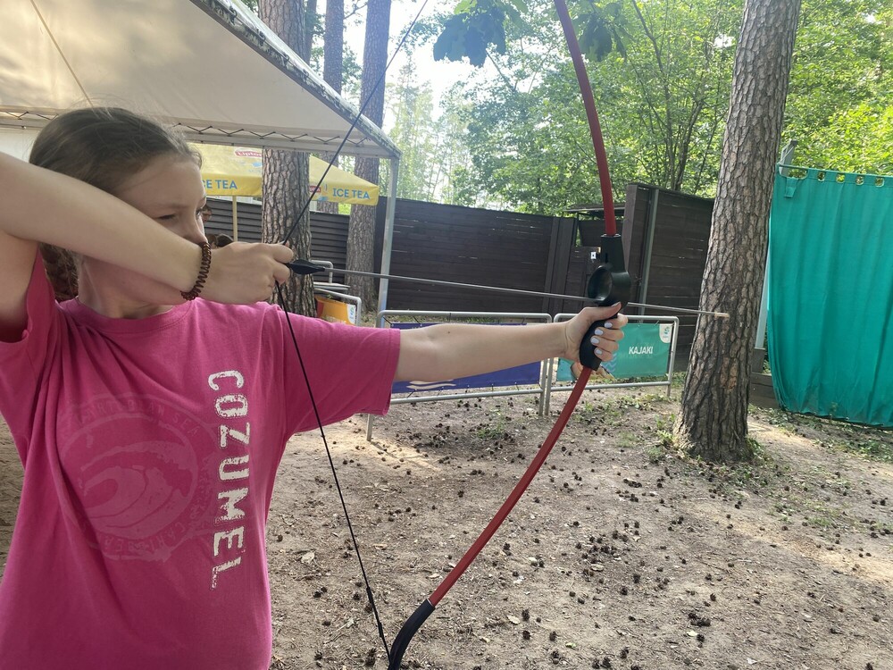 Słoneczny poniedziałek rozpoczęliśmy od ścianki wspinaczkowej. Następnie uczyliśmy się strzelać z łuku. Poznaliśmy budowę łuku i strzały oraz prawidłową postawę strzelecką. Dzisiaj również plażowaliśmy i kąpaliśmy się w jeziorze pod czujnym okiem ratowników. Po obiedzie mieliśmy zajęcia na strzelnicy paintballowej, gdzie oddawaliśmy strzały ze stanowisk do tarcz ustawionych w różnych odległościach. Następnie rozegraliśmy Awanturę o Wiedzę. Nasz dzień zakończyliśmy ogniskiem.