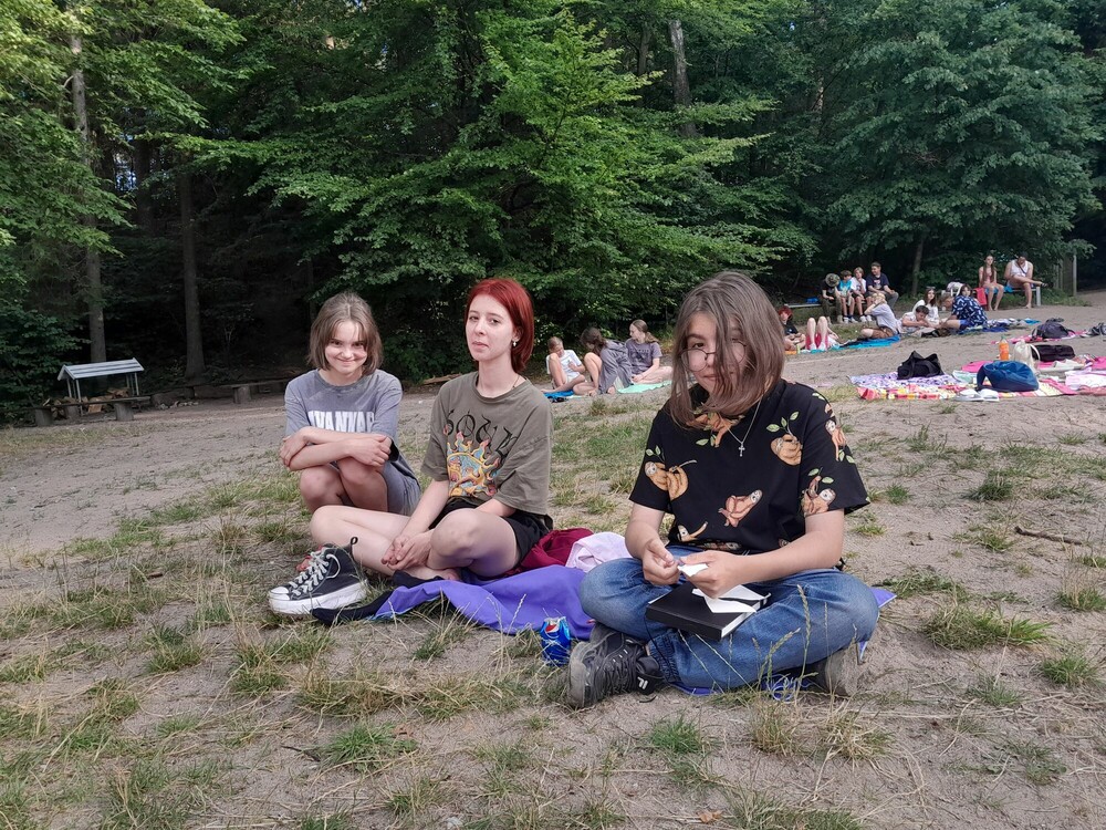 Poranek rozpoczęliśmy od gier i zabaw integracyjnych. Następnie byliśmy na spotkaniu z pielęgniarką. Potem braliśmy udział w zajęciach Ale Cyrk!, podczas których uczyliśmy się chodzenia na szczudłach oraz jeżdżenia na nietypowym rowerze. Strzelaliśmy z wiatrówek i supercelnie nam szło. Poszliśmy na plażę, gdzie mogliśmy się poopalać oraz wykąpać w pięknym jeziorze Łęsk. Na koniec dnia uczestniczyliśmy w grze terenowej Mafia i udało się nam odgadnąć zagadkę.