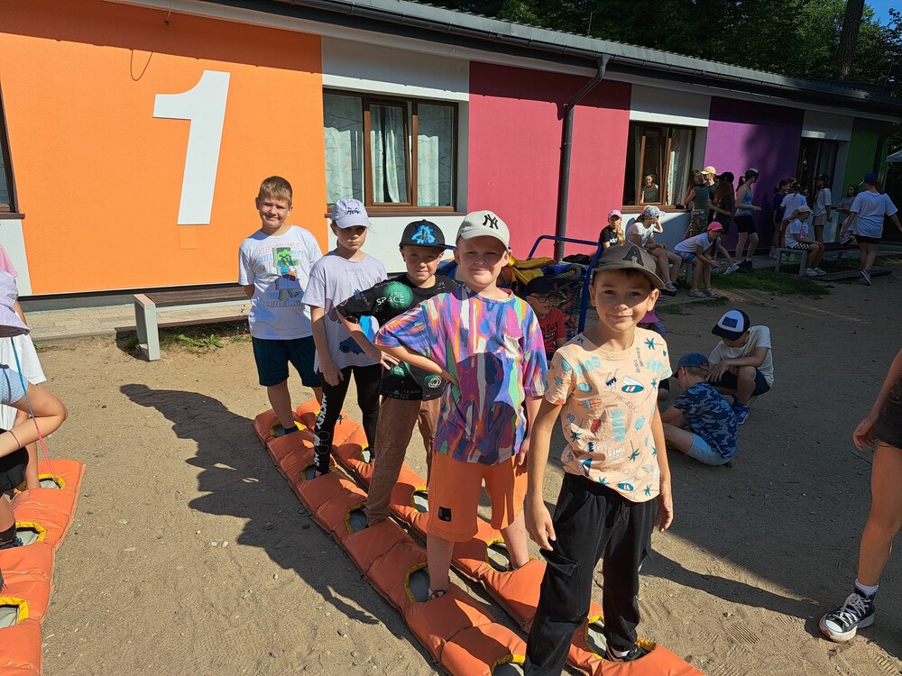 Wstaliśmy dziś rano i poszliśmy na smaczne śniadanko. Następnie udaliśmy się na wspinaczkę po skrzynkach. Byliśmy w uprzęży i budowaliśmy wieżę ze skrzynek oraz wchodziliśmy po niej. Była świetna zabawa. Mogliśmy spróbować sił i odwagi. Następnie graliśmy wraz z innymi grupami w dwa ognie na boisku. Była świetna zabawa. Poznaliśmy jeszcze więcej kolegów i koleżanek. Później poszliśmy na eurobungee. Skakaliśmy wysoko w specjalnych uprzężach na trampolinach. Następnie zjedliśmy pyszny obiad. A potem udaliśmy się na grę terenową Błędny Azymut. Graliśmy na terenie ośrodka. Odgadywaliśmy zagadki korzystając z kompasu. Następnie poszliśmy na plażę. Pan ratownik zapoznał nas z regulaminem kąpieliska. Plażowaliśmy oraz pływaliśmy w jeziorze. Po kolacji poszliśmy na wieczorną grę terenową Mafia. Świetnie się bawiliśmy!