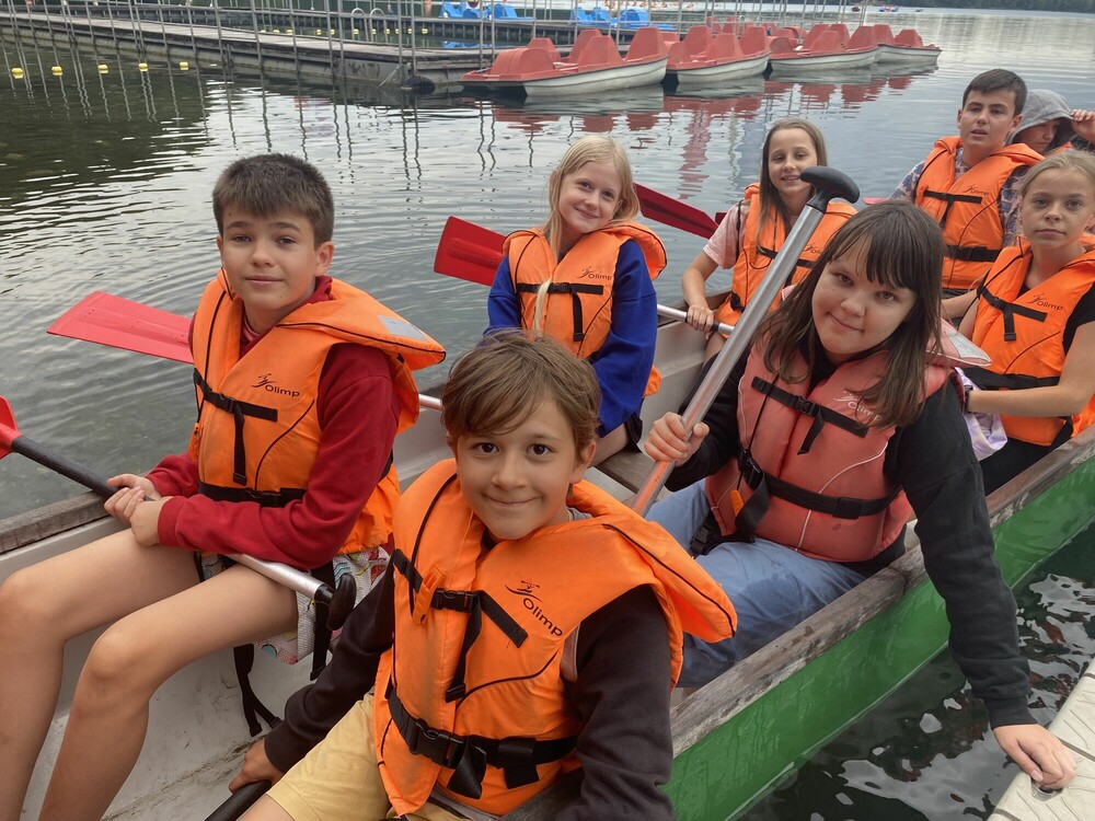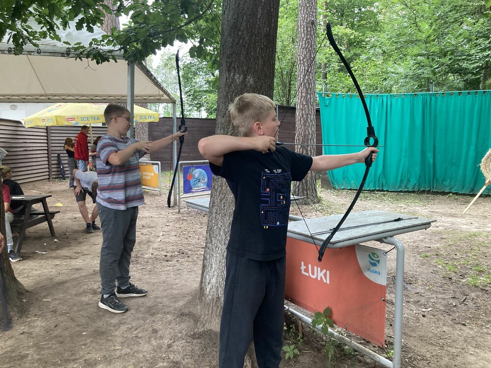 Nasz dzień zaczął się bardzo aktywnie. Wybraliśmy się na kulkowy poligon, na którym pokonaliśmy ciekawy tor quadowy, przejechaliśmy się zwinnym rangerem i stoczyliśmy się specjalnym torem wewnątrz wielkiej dmuchanej kuli. Graliśmy w grę terenową Błędny Azymut, podczas której nauczyliśmy się wyznaczać azymut przy użyciu kompasu. Po jeziorze Łęsk pływaliśmy czteroosobowymi rowerami wodnymi. Poznaliśmy budowę łuku i strzały oraz prawidłową postawę strzelecką, nauczyliśmy się strzelać z łuków. To był dobry dzień!
