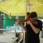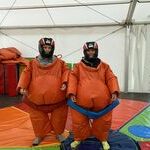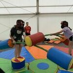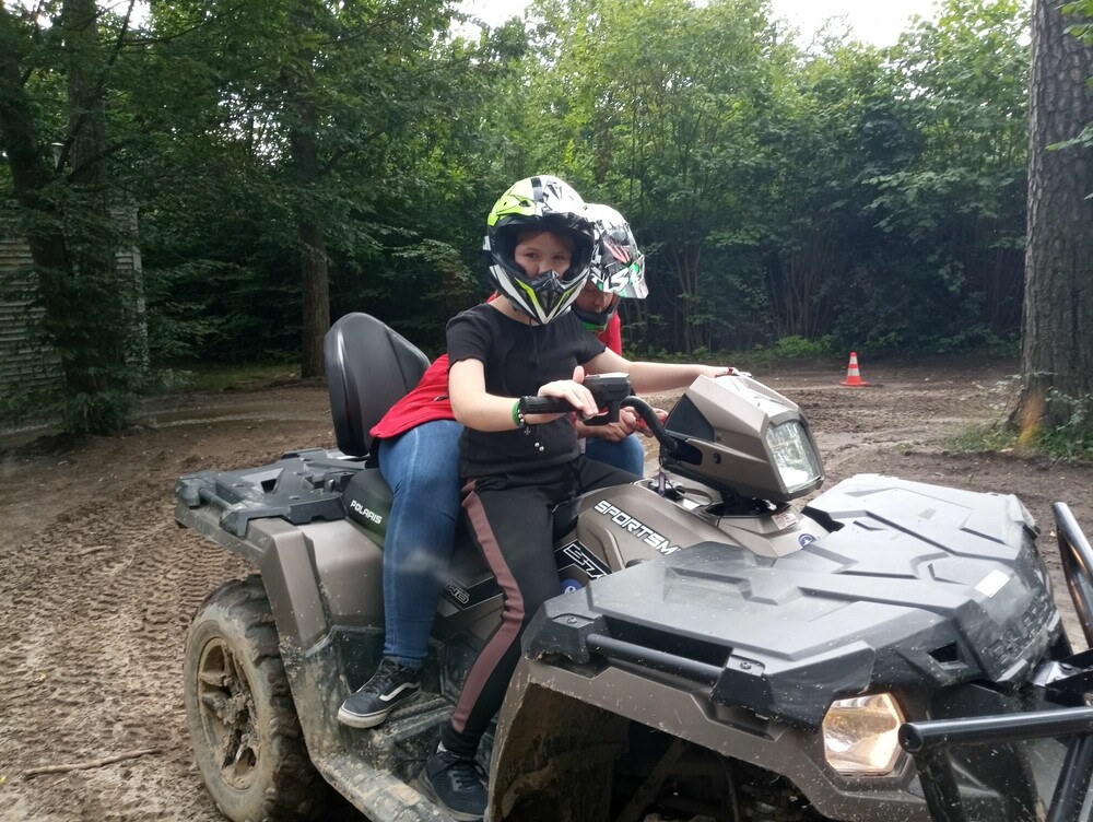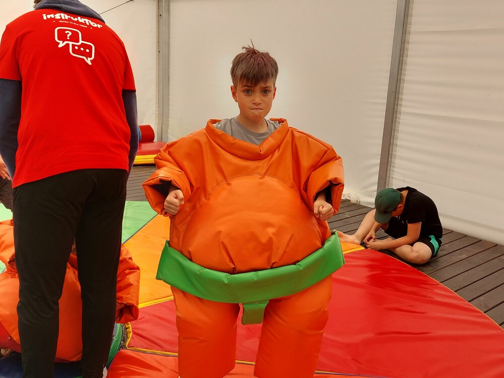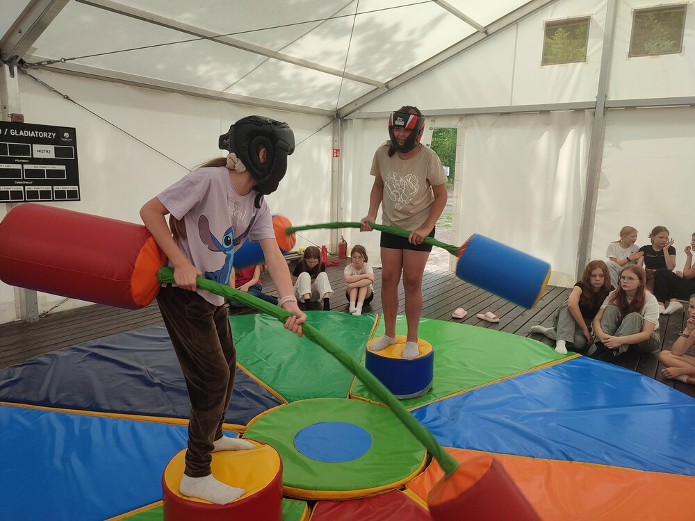Dzień rozpoczęliśmy od wyprawy na kulkowy poligon, gdzie jeździliśmy na quadzie i rangerze oraz wzięliśmy udział w zorbingu. Następnie budowaliśmy wieżę ze skrzynek, na którą się potem wspinaliśmy, zabezpieczeni kaskiem i liną asekuracyjną. Kolejną atrakcją była piłka na opak, czyli rozgrywka meczu piłki nożnej w specjalnych strojach. Na koniec stoczyliśmy walki gladiatorów, używając do tego specjalnych lanc.