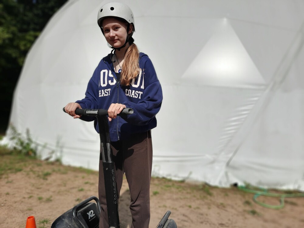 Dzisiaj uczyłyśmy się jeździć na segwayu, korzystając ze specjalnie przygotowanego toru. Następnie poznałyśmy podstawowe układy taneczne tańców nowoczesnych. Również plażowałyśmy oraz kąpałyśmy się w jeziorze. Na zajęciach z waterballem próbowałyśmy utrzymać równowagę, będąc w środku dmuchanej kuli, która była umieszczona na wodzie. Nasz dzień zakończyłyśmy bardzo tanecznie i z dobrymi humorami, ponieważ bawiłyśmy się na dyskotece.
