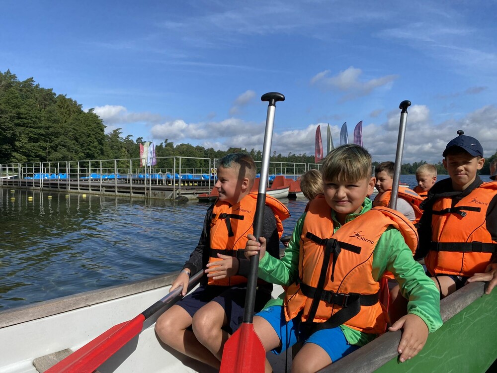 Nowy tydzień rozpoczęliśmy od kolejnej wyprawy po jeziorze, tym razem wieloosobową smoczą łodzią. Pogoda była wspaniała, a my dawaliśmy z siebie wszystko i dostaliśmy pochwały od kapitana. Słońce mocno przyświecało, więc skorzystaliśmy też z uroków kulkowej plaży i kąpieliska. Przed obiadem czekała na nas gra terenowa Błędny Azymut, podczas której nauczyliśmy się wyznaczać azymut przy użyciu kompasu, by następnie rozwiązać specjalnie przygotowane zagadki i rozszyfrować hasło. Kolejną atrakcją było eurobungee, na którym mogliśmy poczuć się jak w strefie antygrawitacyjnej. Następne zajęcia były bardzo sportowe. Rozgrywki piłki nożnej, ziemniaka i zbijaka umiliły nam czas przed kolacją. Dzień zakończyliśmy integracyjnym ogniskiem z grami i zabawami oraz pieczeniem kiełbasek.