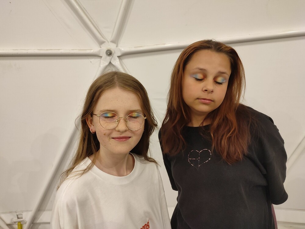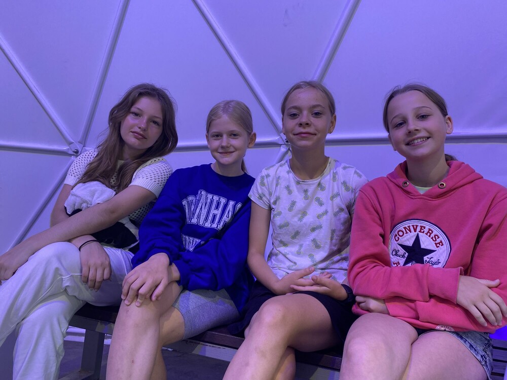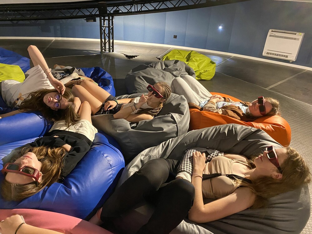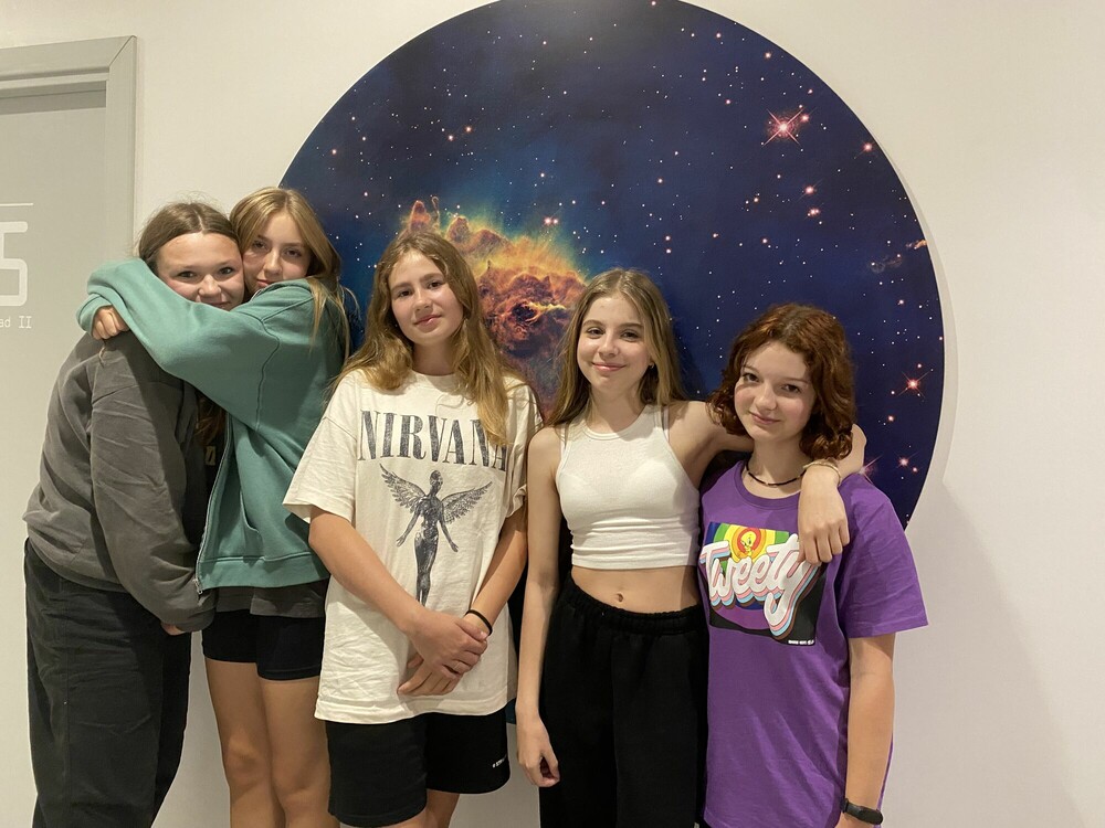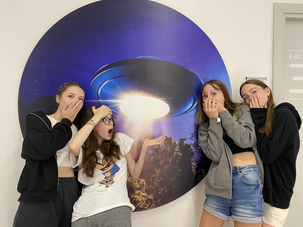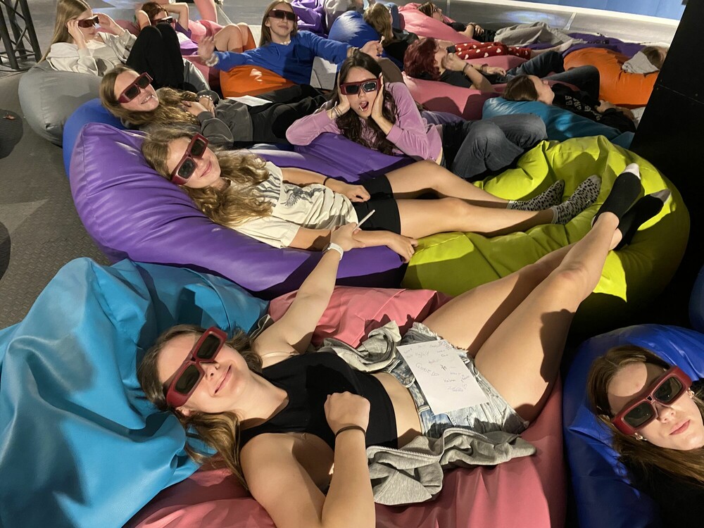 Dzień zaczęłyśmy od aktywnej gry integrującej naszą grupę - ludzie do ludzi. Musiałyśmy wykazać się zręcznością i pomysłowością. Następnie wykorzystując nasze doszlifowane umiejętności aktorskie, napisałyśmy i przedstawiłyśmy nasze autorskie spektakle. Przed obiadem obejrzałyśmy seans w niesamowitym kinie sferycznym. Po obiedzie, jak prawdziwe astronautki, przeżyłyśmy trening na żyroskopie. Później bawiłyśmy się w głuchy telefon na słowa i gesty, a dzień zakończyłyśmy apelem podsumowującym nasz obóz.