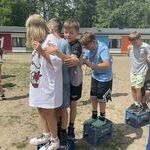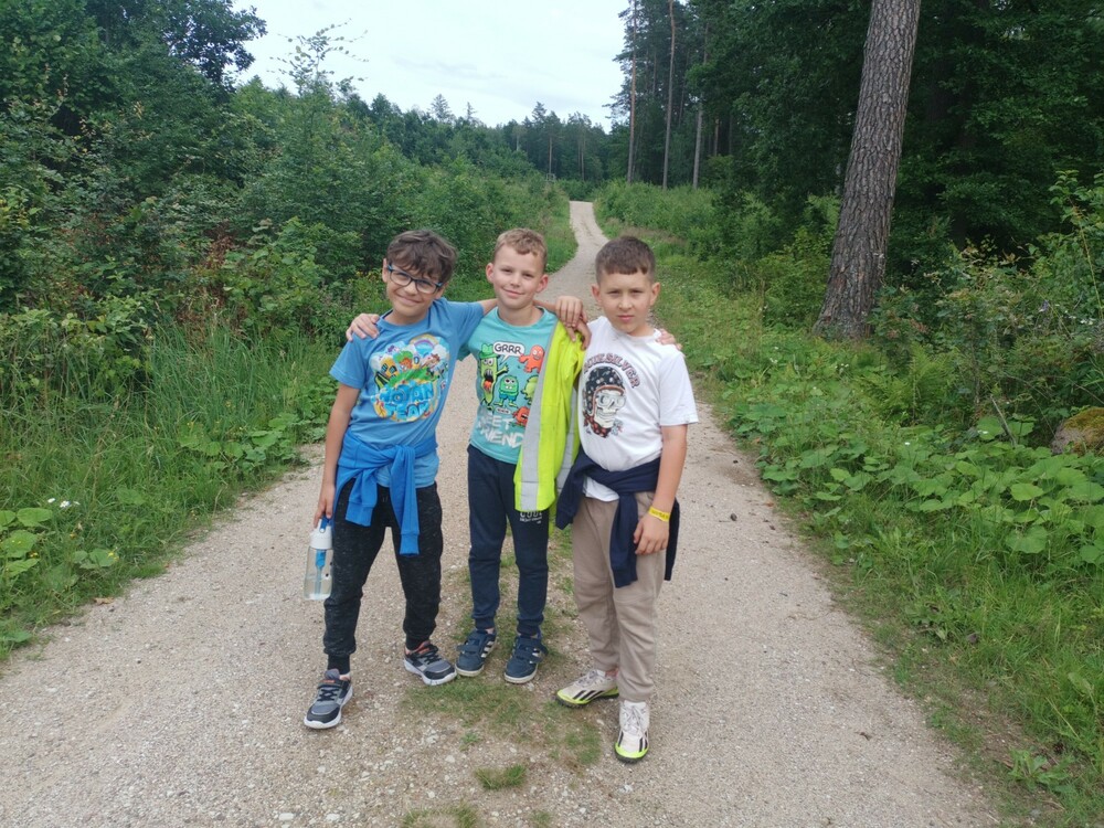 Dziś rozpoczęliśmy od rejsu smoczą łodzią po jeziorze Łęsk. Płynąc podziwialiśmy piękne mazurskie krajobrazy i różne gatunki ptaków, które udało nam się zaobserwować. Następnie trenowaliśmy równowagę i skupienie podczas wspinania się na wieżę ze skrzynek. Eskortowani przez tajemniczego oficera tajności odkryliśmy zakamarki Strefy UFO, bardzo nas zaciekawiły te zajęcia. Korzystając z pogody po pysznym obiadku udaliśmy się na plażę, a czas spędzony tam umiliły nam gry karciane oraz piłka plażowa. Wykazać się kreatywnie mieliśmy okazję przy robieniu bransoletek. Zwieńczeniem dnia była niesamowita pełna tańców i śpiewu dyskoteka, na której wytańczyliśmy się chyba za wszystkie czasy.