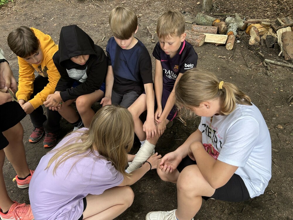 Drugi dzień zaczęliśmy od tworzenia bransoletek z linki, to było ciekawe wyzwanie. Odwiedziliśmy Strefę UFO, przekraczając bramę tajnej bazy. Korzystając z promieni słońca odpoczywaliśmy na plaży. Poznaliśmy również zasady udzielenia pierwszej pomocy i wykorzystaliśmy je w praktyce podczas gry terenowej. Na koniec dnia przeszliśmy ćwiczenie astronauty na kosmicznym żyroskopie. Świetnie zaczynamy te kolonie!