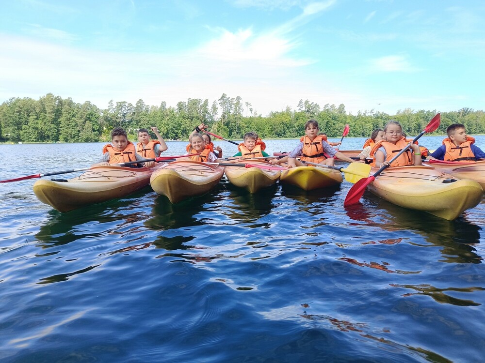 Pierwszy dzień półkolonii obfitował w różnorodne atrakcje. Nietypowym urządzeniem był żyroskop. To urządzenie pozwala na doświadczenie nieważkości. Mieliśmy okazję popływać na kajakach. Nawet ci, którzy mieli pierwszy raz wiosło w rękach, opanowywali podstawowe techniki i cieszyli się przyjemności z pływania. Odbyły się też zajęcia malowanie na folii. Po obiedzie każdy mógł spróbować swoich sił na ściance wspinaczkowej.