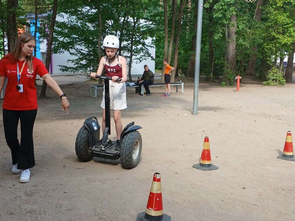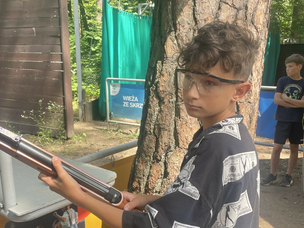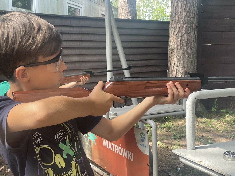 Słoneczny poniedziałek rozpoczęliśmy od zajęć, na których poznaliśmy postawę strzelecką oraz nauczyliśmy się posługiwać wiatrówką sprężynową. Następnie ze stanowisk strzeleckich oddawaliśmy strzały do tarcz. Później ubrani w specjalne uprzęże układaliśmy wieżę ze skrzynek, jednocześnie wspinając się po niej. Po obiedzie przeszliśmy dwa poziomy trudności w parku linowym. Na następne zajęcia wybraliśmy się nad jezioro, a tam wzięliśmy udział w wyprawie jednoosobowymi kajakami. Dzień zakończyliśmy nauką jazdy na segwayu po specjalnym torze.