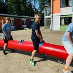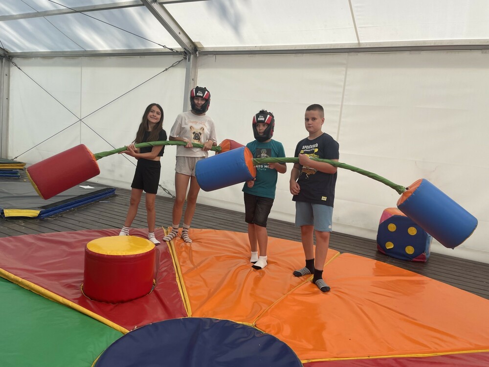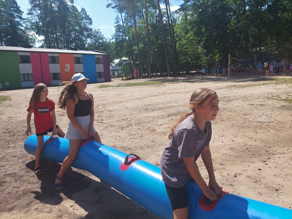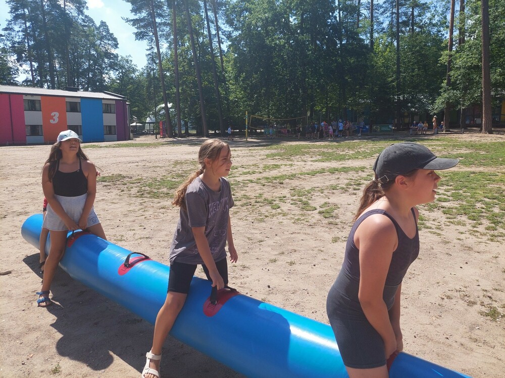 Rejs kajakami turystycznymi to była idealna aktywność na początek tak słonecznego dnia. Znowu bylibyśmy też na plaży, gdzie pograliśmy w piłkę plażową. Wcieliliśmy się w prawdziwych rzymskich wojowników podczas walk gladiatorów. Ubrani w kaski pojedynkowaliśmy się na gumowe lance. Toczyły się zacięte pojedynki. Po pysznym obiedzie integrowaliśmy się podczas wspólnych gier i zabaw. Jak prawdziwi astronauci kręciliśmy się w żyroskopie. Było to niesamowite doświadczenie nie z tej ziemi. Wieczorem odbyła się impreza na Poziomie X z tańcami i muzyką. Ten dzień zaliczamy do wyjątkowo udanych.