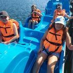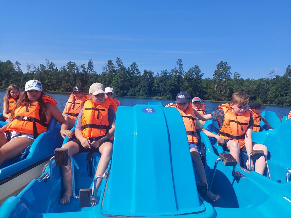 Czwarty dzień kolonii rozpoczęliśmy od wodnych przygód. Rowerki wodne bardzo nas odprężyły. Dzięki temu mieliśmy siłę na Akcje Integrację! Gry zespołowe wycisnęły z nas ostatnie poty, ale podołaliśmy wszyscy wspólnie, dało nam to mnóstwo zabawy i uśmiechu. Poznaliśmy dziś też skrywaną tajemnicę UFO, skakaliśmy na eurobungee a dzień zakończyliśmy grą terenową, rozwiązując zagadki naukowe, jakie zostawił nam nieznany przybysz.