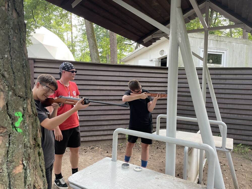Środę rozpoczęliśmy od nauki strzelania z wiatrówek. Wyłoniliśmy również najlepszego snajpera w grupie. Następnie udaliśmy się do lasu na zajęcia z survivalu, podczas których nabyliśmy trochę wiedzy teoretycznej oraz nauczyliśmy się wykonywać schrony przy pomocy pałatek. Mieliśmy też okazję z strzelać z łuków do specjalnych tarcz. Po obiedzie udaliśmy się na plażę i korzystając z pięknej, ciepłej pogody zanurzyliśmy się w wodzie. Odbyliśmy też kilka partyjek mega gier. Dzień zakończyliśmy grą terenową o nazwie Świetliki, podczas której odpowiadaliśmy na pytania, aby odnaleźć ukryty skarb.