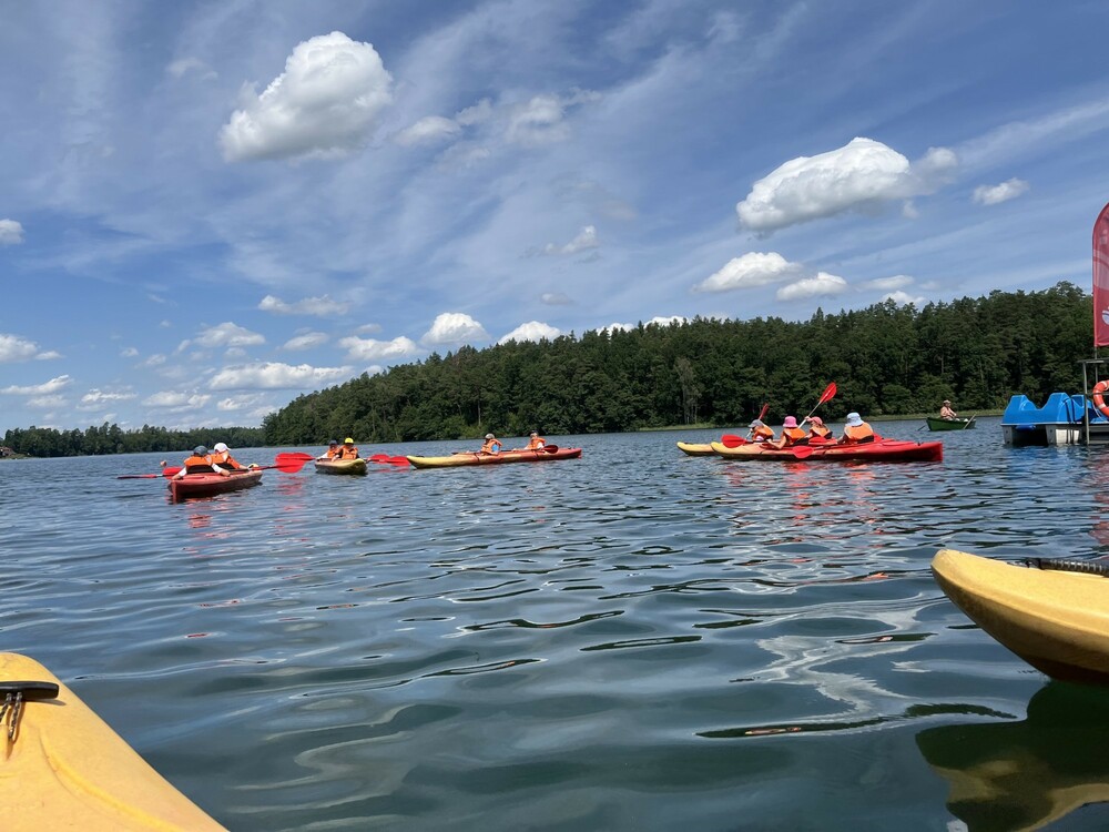 Czwarty dzień zajęć rozpoczęliśmy od grania w różne gry integracyjne oraz planszowe. Następnie zagraliśmy w grę terenową selfie challenge, podczas której naszym zadaniem było wykonanie jak największej liczby zdjęć z określonymi osobami lub przedmiotami. Potem udaliśmy się nad jezioro, aby skorzystać z pięknej pogody. Po obiedzie wybraliśmy się do Strefy UFO, aby sprawdzić naszą wiedzę podczas Kulkowej Akademii Wiedzy. Zaraz potem przyszła kolej na nasze pierwsze zajęcia wodne na jednoosobowych kajakach sit on top. Wieczorem na zakończenie dnia sprawdziliśmy naszą wytrzymałość na żyroskopie.