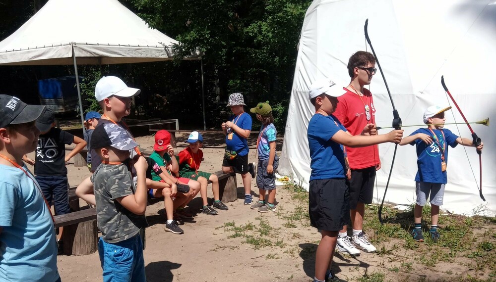 Dziś minęła połowa naszej kolonii. Dzień rozpoczęliśmy wirtualnymi dywanami - grami i zabawami w częściowo wirtualnym świecie. Później wyposażeni w uprząż oddawaliśmy skoki na trampolinie. Następnie poznaliśmy budowę łuku i strzały, prawidłową postawę strzelecką, a także nauczyliśmy się strzelać z łuków. Po południu budowaliśmy wieżę ze skrzynek, jednocześnie wspinając się na nią. Potem wybraliśmy się na spacer Leśną Ścieżką Edukacyjną. Wieczorem udaliśmy się na ognisko z pieczeniem kiełbasek.