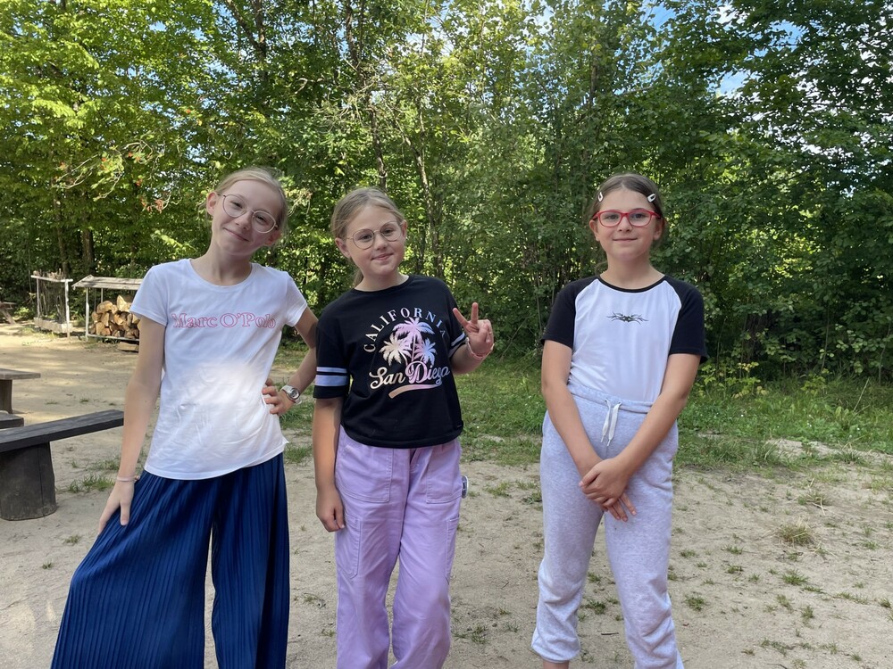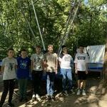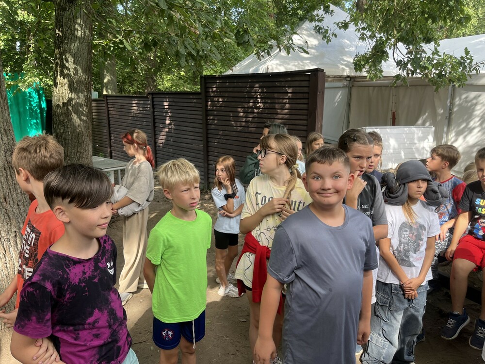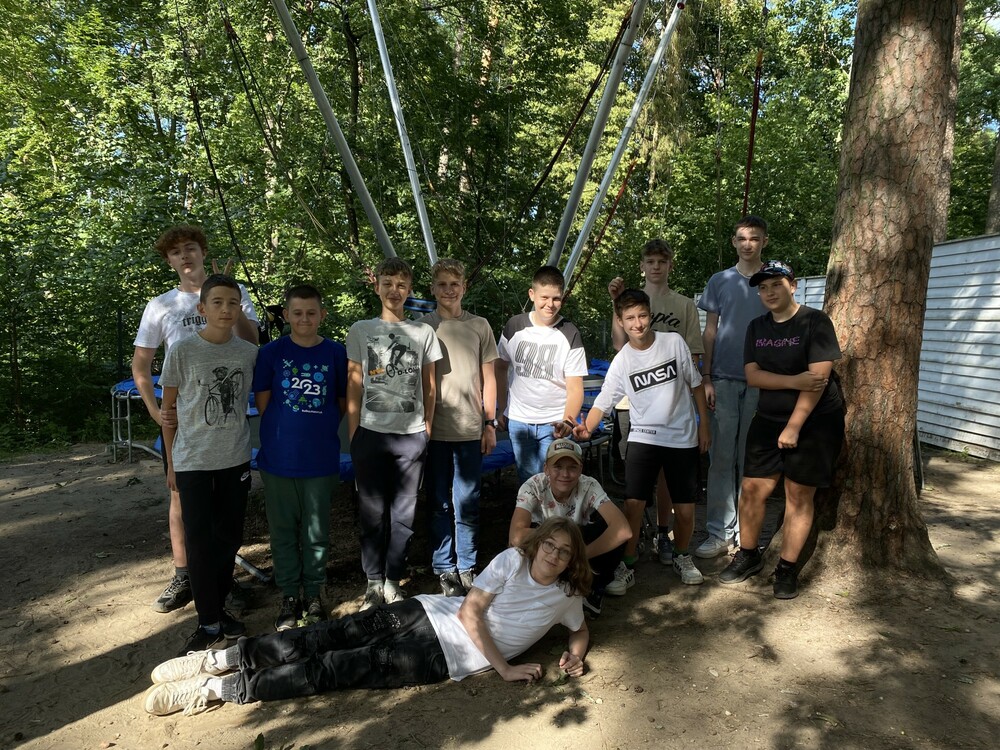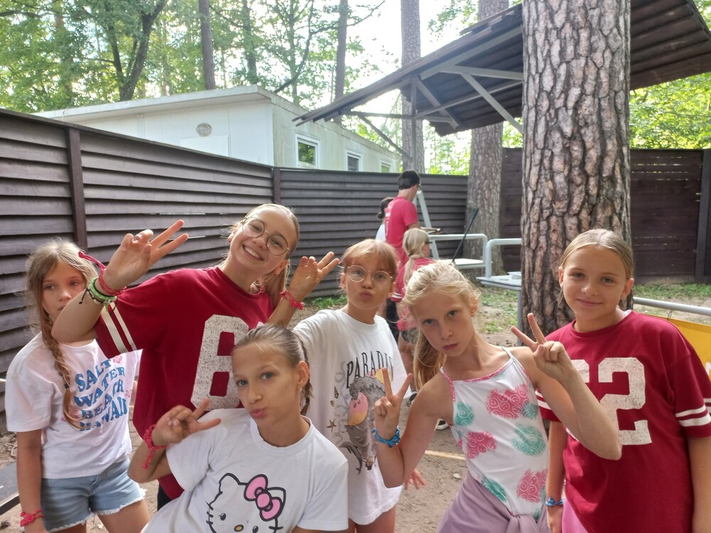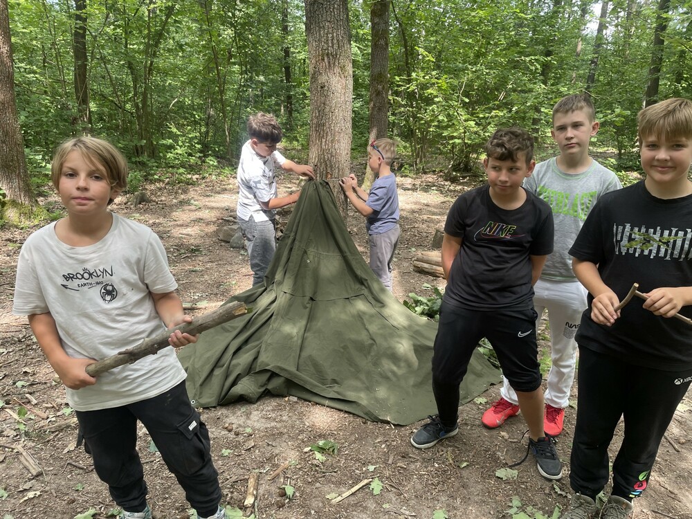 Dziś rano spędziliśmy czas na podobozie. Graliśmy w różne gry planszowe oraz kilka rund gry w mafię. Następnie wybraliśmy się do lasu na zajęcia w lesie. Tam zagraliśmy w ciekawą zabawę polegającą na zrywaniu sobie nawzajem opasek z rąk. Po obiedzie weszliśmy na park linowy, na którym czekały nas dwie trasy do przejścia. Dziś znaleźliśmy też czas na to, żeby namalować naszą flagę. Ostatnie dzisiejsze zajęcia to seans filmowy w kinie sferycznym.