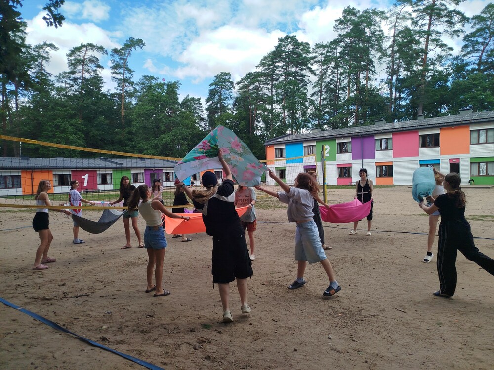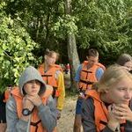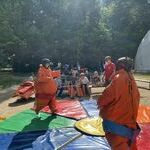 Dzień rozpoczęliśmy od spływu kajakowego, który dał nam okazję do relaksu i podziwiania pięknych widoków. Po tej wodnej przygodzie przenieśliśmy się do parku linowego, gdzie mieliśmy okazję sprawdzić swoją zręczność i odwagę, pokonując trasy zawieszone wysoko nad ziemią. Kolejną atrakcją było budowanie wieży ze skrzynek. Wspólnie ustawialiśmy skrzynki, a potem staraliśmy się wejść jak najwyżej, co było zarówno wyzwaniem, jak i świetną zabawą. Po tych fizycznych aktywnościach nadszedł czas na coś bardziej kreatywnego – tworzenie flag. Każda grupa miała okazję wykazać się pomysłowością, projektując flagę reprezentującą nasz zespół. Dzień zakończyliśmy seansem filmowym w naszym obozowym kinie. To był intensywny i pełen emocji dzień.