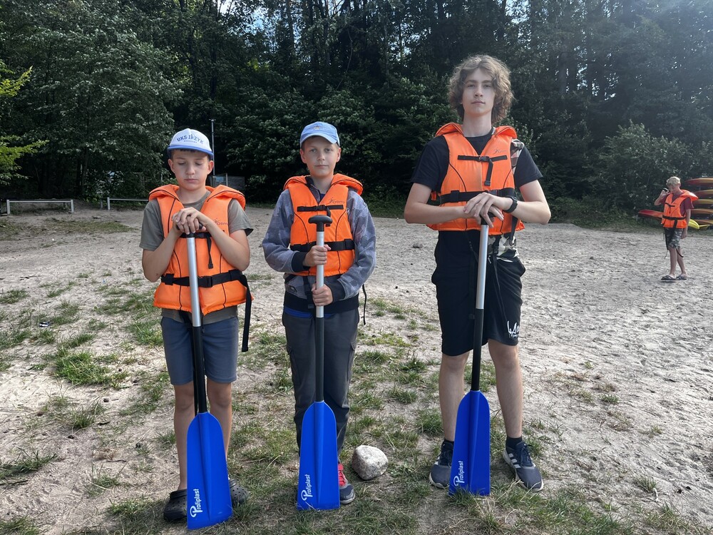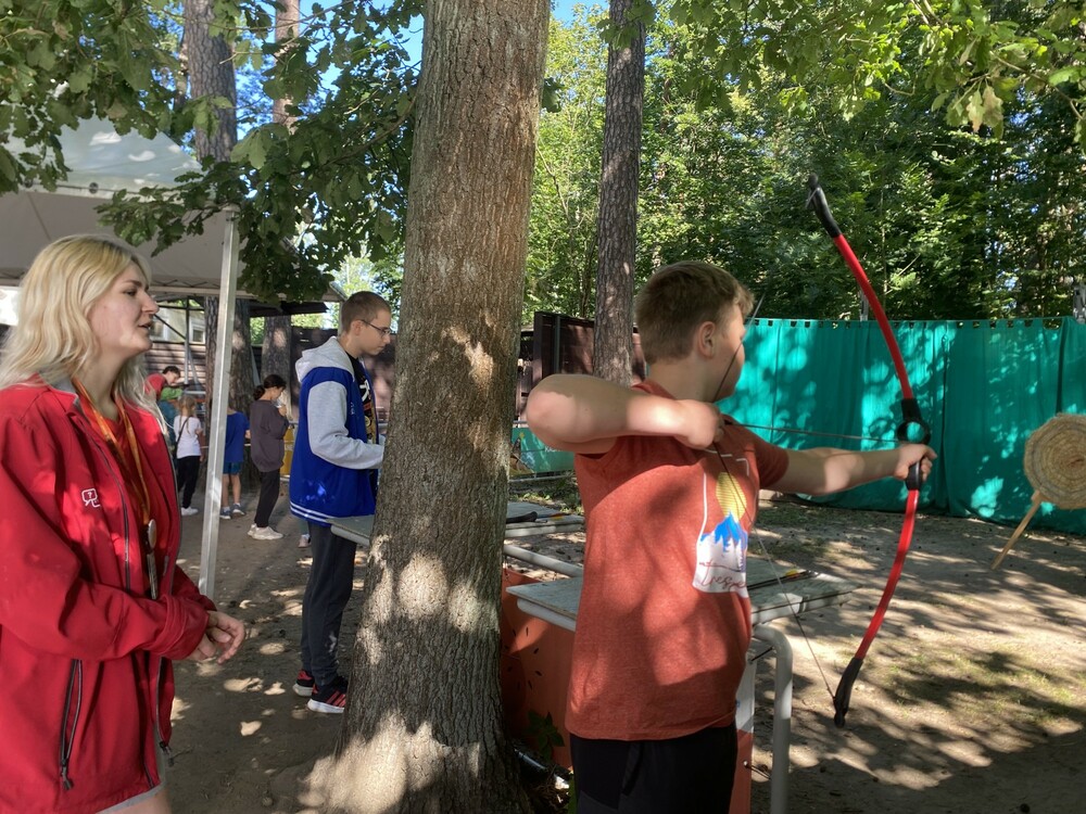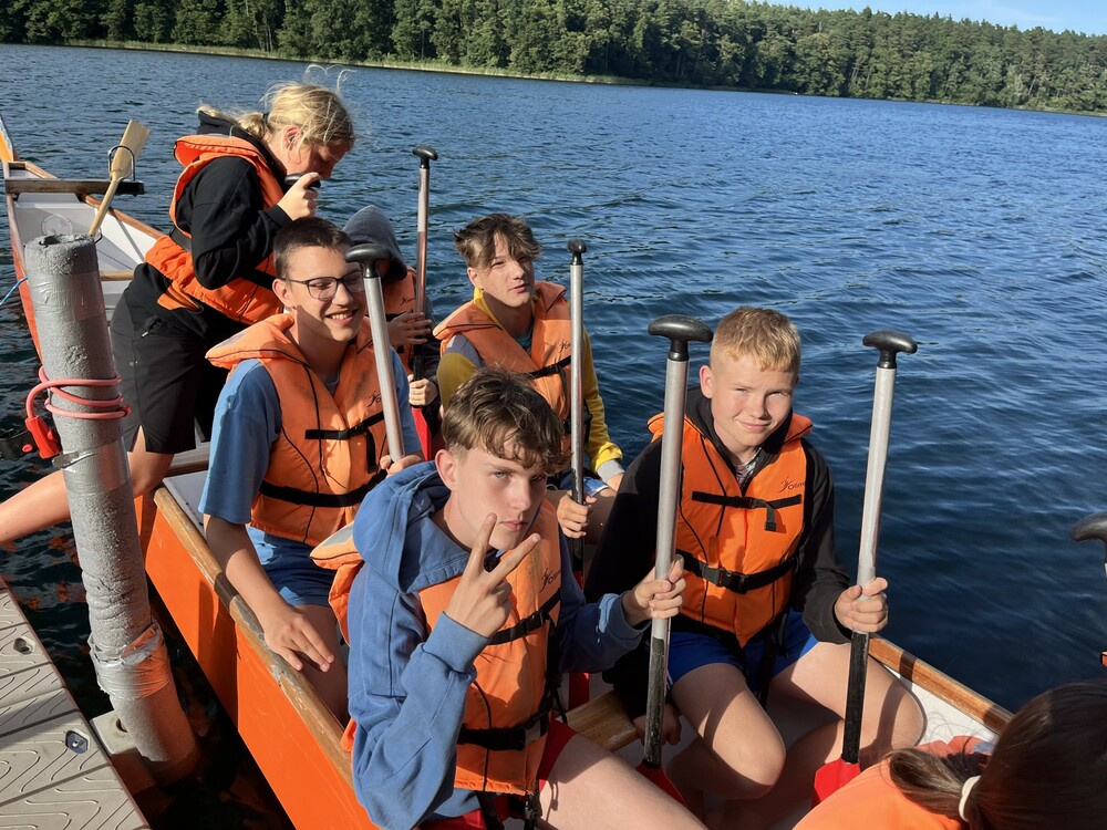 Za nami kolejny bardzo aktywny dzień. Dzisiejszy poranek zaczęliśmy od wyprawy kajakami jednoosobowymi po jeziorze Łęsk. Następnie rozegraliśmy turniej siatkówki oraz graliśmy w koszykówkę. Kolejnym punktem naszego dnia była wyprawa po jeziorze smoczą łodzią. Po obiedzie udaliśmy się do lasu, gdzie poznaliśmy zasady survivalu i nauczyliśmy się budować schronienie przy użyciu wojskowej pałatki. Następnie poznaliśmy budowę łuku i strzały oraz prawidłową postawę strzelecką, a także nauczyliśmy się strzelać. Nasz dzień zakończyliśmy tanecznie podczas imprezy na Poziomie X.