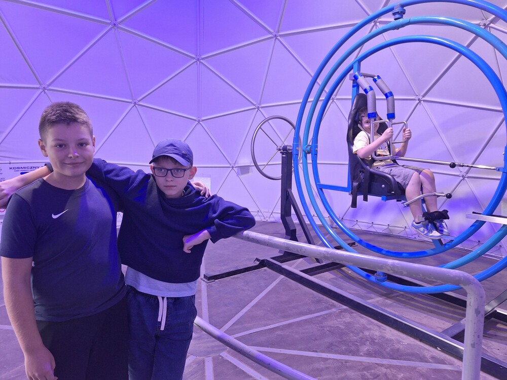 Nasz dzień zaczęliśmy od wyjścia na poligon. Czekały tam na nas takie atrakcje, jak przejażdżka quadem i rangerem. Była tam również zorba, czyli wielka kula, wewnątrz której się przemieszczaliśmy. Po pysznym obiedzie przyszedł czas na plażowanie. Następnie przeszliśmy szkolenie na kosmicznym żyroskopie, czyli symulatorze wrażeń panujących podczas startu do gwiezdnego lotu. Na koniec dnia odwiedziliśmy Strefę UFO. Weszliśmy do kokpitu spodka, zobaczyliśmy film o historii Kosmicznych Mazur, a w Laboratorium przetestowaliśmy urządzenia kosmitów i osiągnęliśmy najwyższy poziom wtajemniczenia.