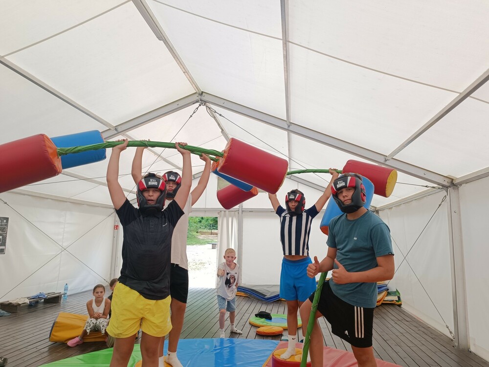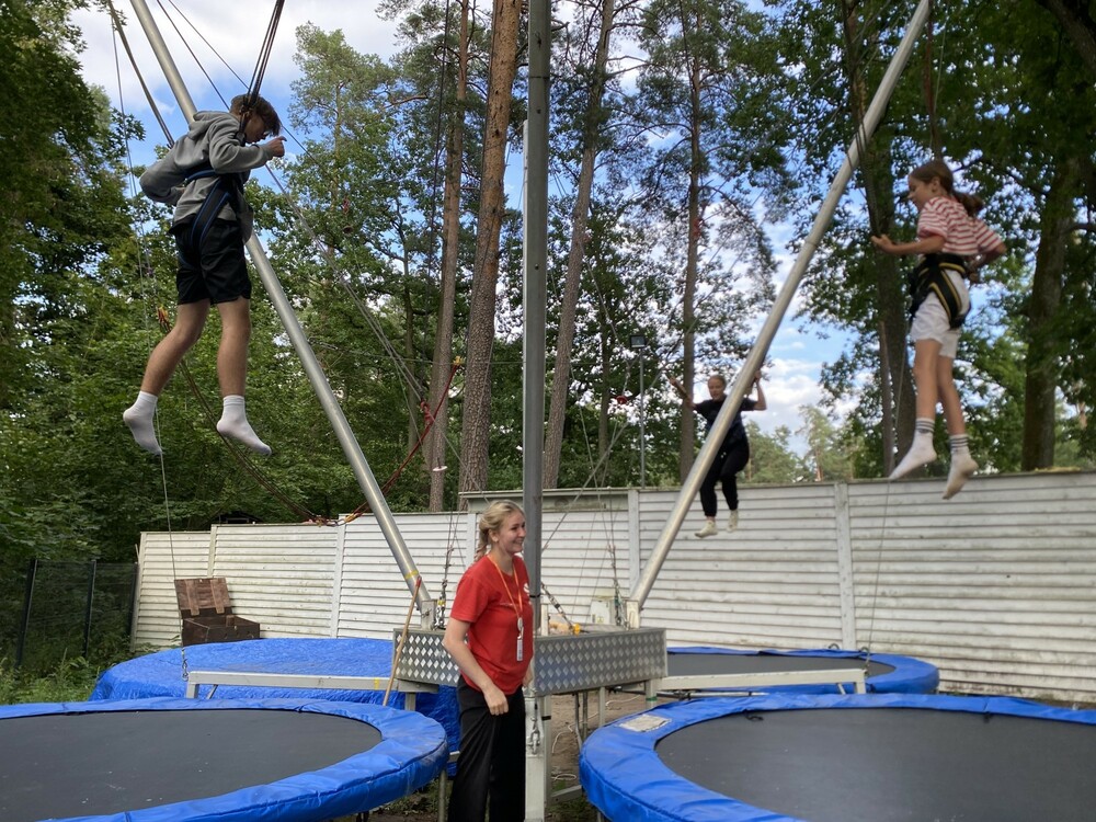 Dziś dotykaliśmy chmur! Wyposażeni w bezpieczne uprzęże skakaliśmy na eurobungee. Nadszedł czas na pożegnania i wspomnienia. Dostaliśmy certyfikaty i zrobiliśmy sobie pamiątkowe zdjęcie. Ponownie mieliśmy szanse poruszać się do naszych ulubionych piosenek. Wspólnie wymyślaliśmy układy taneczne. Skorzystaliśmy z pięknej pogody i ostatni raz kąpaliśmy się w jeziorze. Później wspinaliśmy się na wieżę ze skrzynek a na koniec dnia braliśmy udział w apelu, na którym podsumowaliśmy całe kolonie.