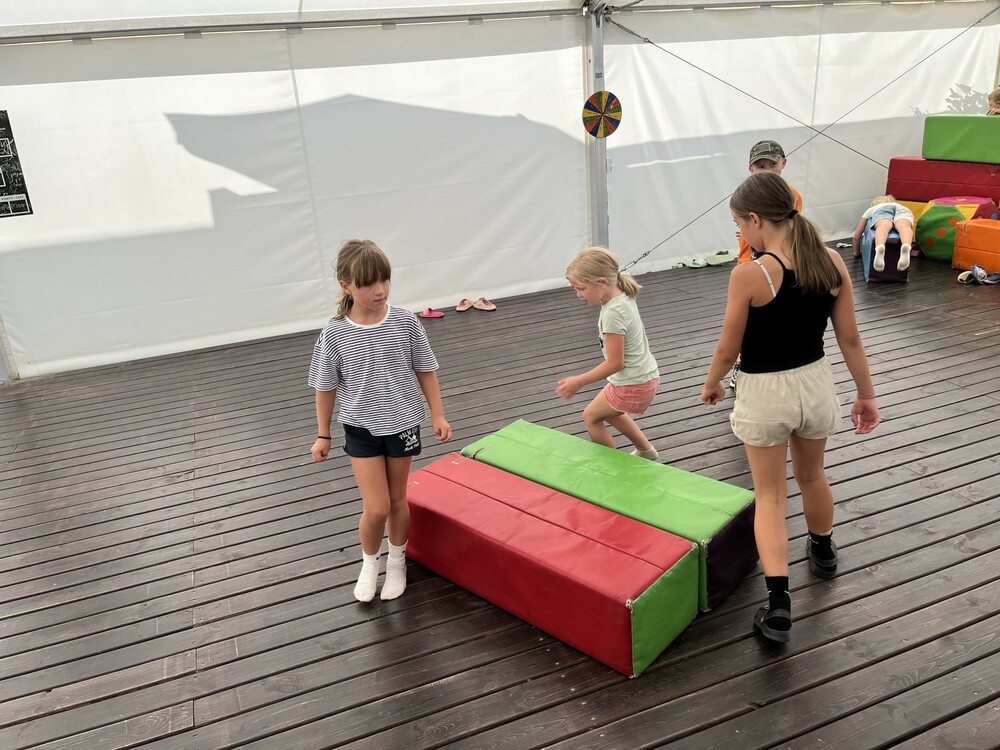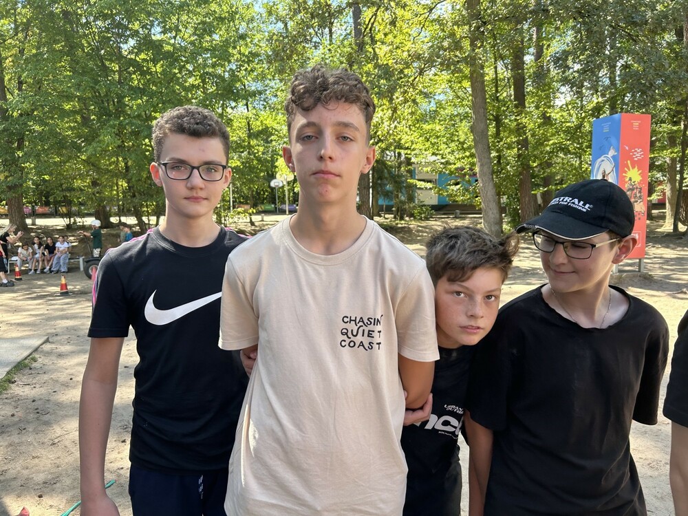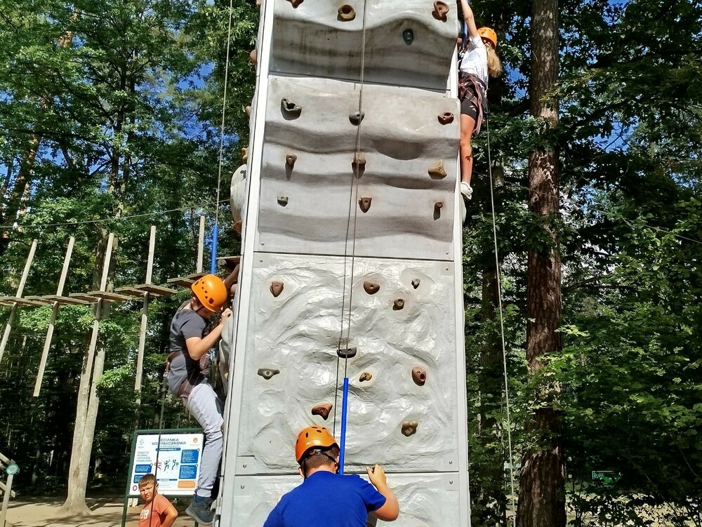 Poranek rozpoczęliśmy sportowo, ponieważ graliśmy w piłkę nożną i siatkówkę. Następnie byliśmy na walkach gladiatorów. Wyposażeni w gumowe lance rywalizowaliśmy na specjalnej macie. Zabawa była świetna! Później uczyliśmy się jeździć na segwayu po przygotowanym torze. Po obiedzie kąpaliśmy się w jeziorze i odpoczywaliśmy na plaży. Następnym punktem naszego dnia była ścianka wspinaczkowa. Mieliśmy możliwość pokonania czterech tras o różnych poziomach trudności. Nasz dzień zakończyliśmy tanecznie podczas dyskoteki.