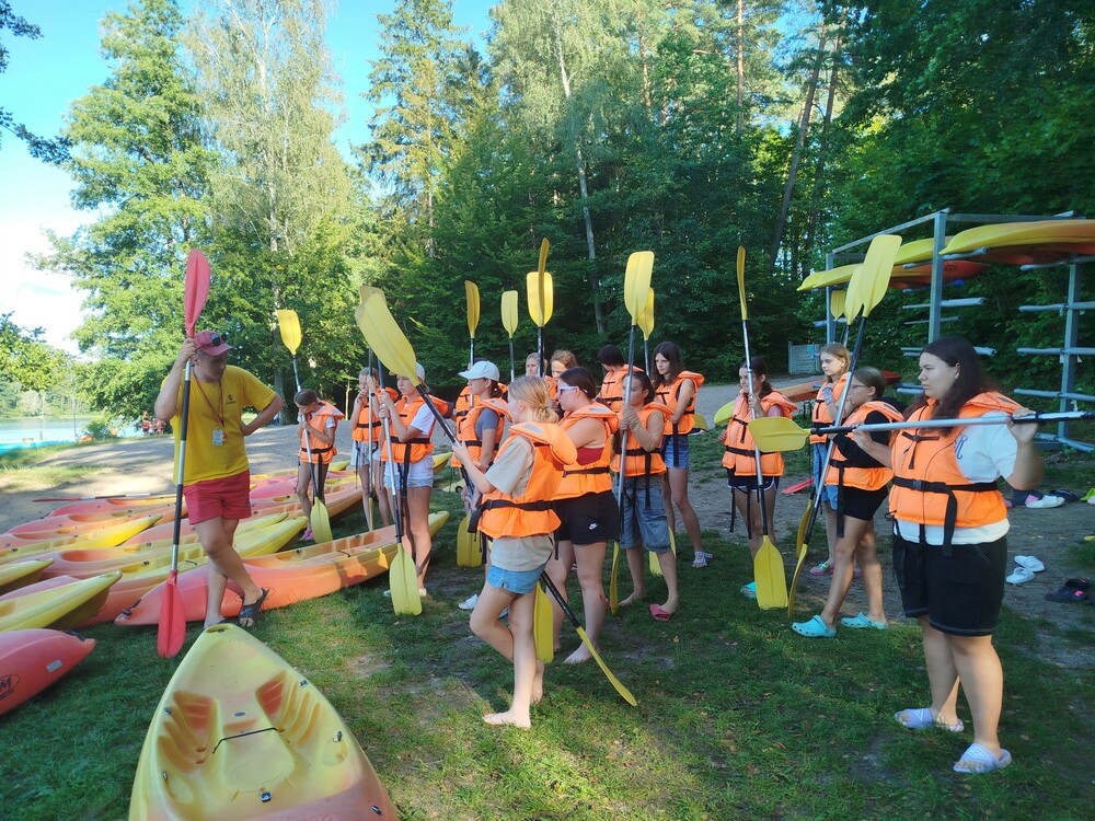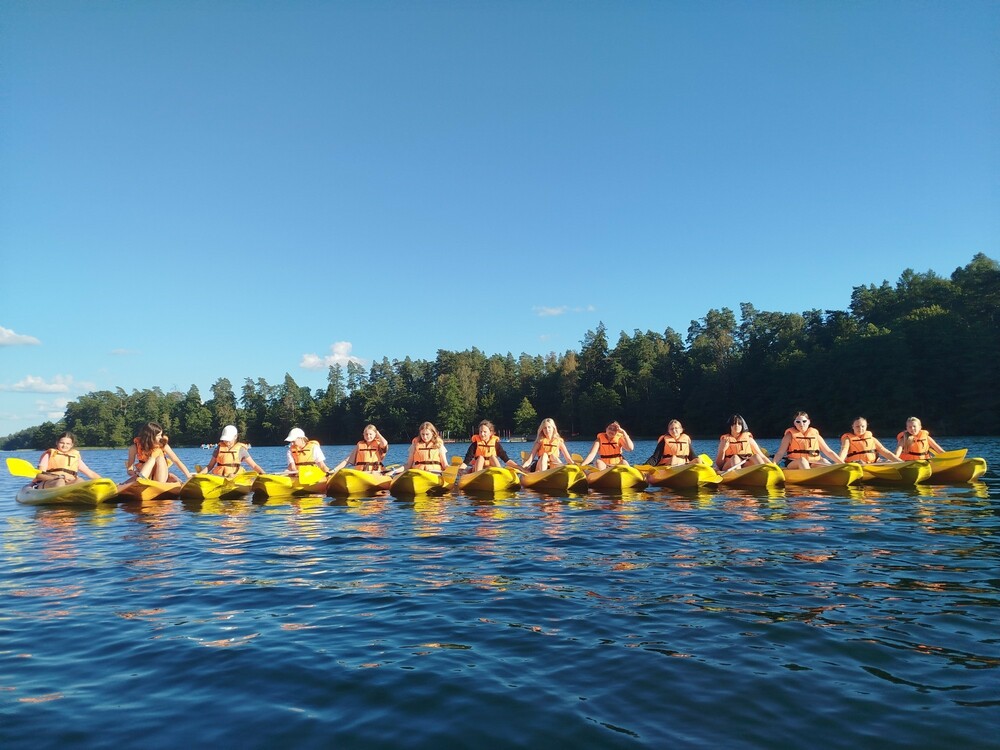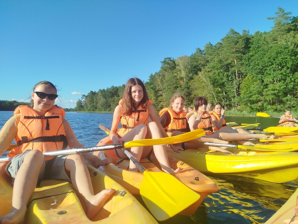 Dzień rozpoczęliśmy od rejsu kajakami turystycznymi po jeziorze Łęsk. Podziwialiśmy piękne mazurskie krajobrazy i różne gatunki przelatujących w pobliżu ptaków. Późniejsze plażowanie przy pogodzie, jaka nam towarzyszyła, to była czysta przyjemność. Kąpaliśmy się, a niektórzy z nas wybrali opcję opalania się na brzegu. Na strzelnicy paintballowej odbywaliśmy trening snajperski, rozegraliśmy również turniej. Na koniec dnia wcieliliśmy się w japońskich zawodników sumo i stoczyliśmy pojedynki w specjalnych strojach i kaskach.