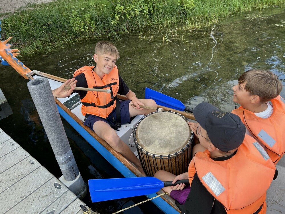 Ten słoneczny dzień zaczęliśmy od wyprawy smoczą łodzią po jeziorze Łęsk. Jeden z nas nadawał rytm wiosłującym, uderzając w bęben. Potem razem z drugą grupą braliśmy udział w zabawach i grach integracyjnych. Wspólnie działaliśmy i poszło nam doskonale. Spędzaliśmy miło czas na plaży, opalając się. Przekroczyliśmy bramę tajnej Strefy UFO, osiągając trzeci, najwyższy poziom wtajemniczenia. Dzień zakończyliśmy starciem łuczników.