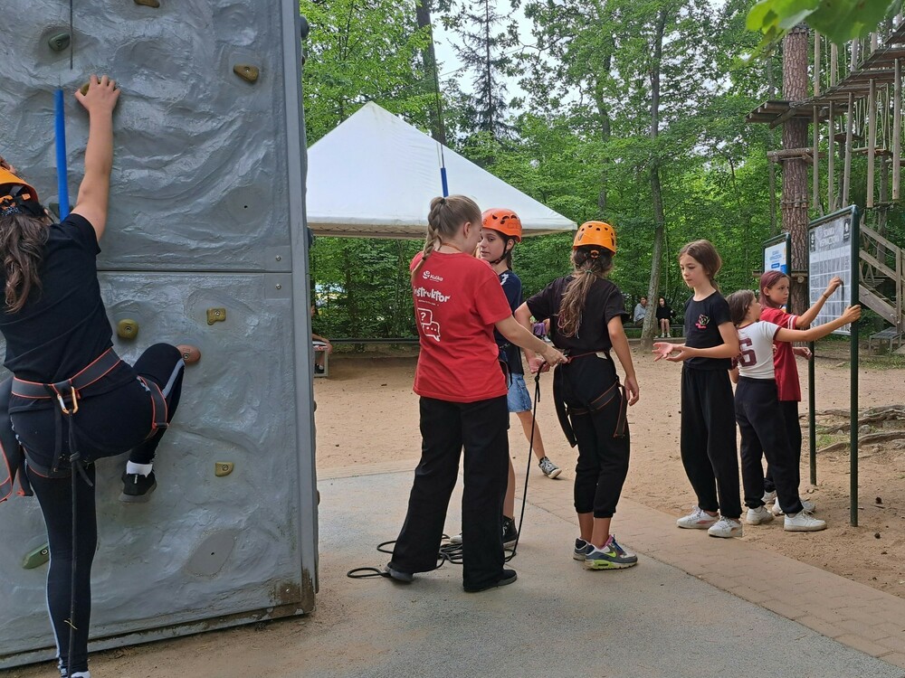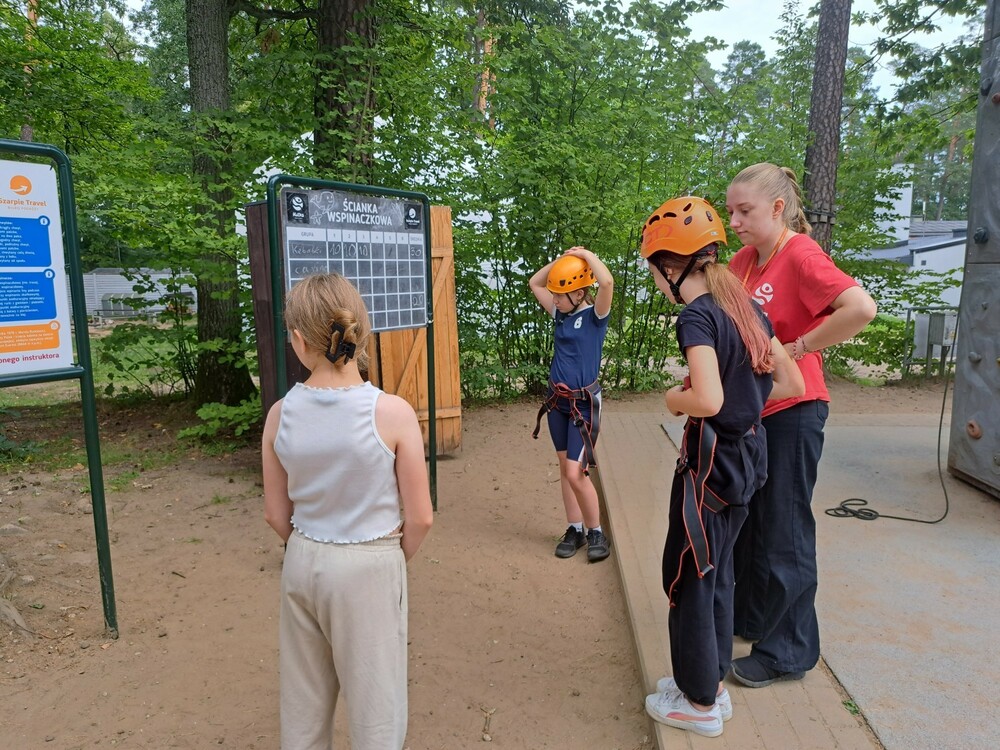 Czwartek rozpoczęliśmy od selfie challenge. Otrzymaliśmy listę zdjęciowych zadań do zrealizowania. Dzięki temu mamy super pamiątkę! Następnie odpoczęliśmy na plaży oraz kąpaliśmy się w jeziorze. Później pokonaliśmy cztery trasy o różnych poziomach trudności na ściance wspinaczkowej. Poznaliśmy też zasady udzielania pierwszej pomocy oraz zbudowaliśmy własne nosze. Wieczorem wybraliśmy się do lasu, aby odnaleźć zaginioną mapę. Za każdą rozwiązaną zagadkę otrzymywaliśmy jej kawałek. Po powrocie na teren ośrodka złożyliśmy mapę w całość i w ten sposób odnaleźliśmy słodki skarb.