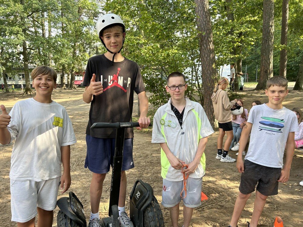 To już nasz czwarty dzień w Ośrodku Kulka! Dziś spędziliśmy go bardzo aktywnie, graliśmy w siatkówkę i koszykówkę, to nasze ulubione sporty. Uczyliśmy się jeździć na segwayu, czyli elektrycznym dwukołowym pojeździe. Tor był wymagający, świetnie daliśmy sobie radę. Potem graliśmy w mega gry. Sprawdziliśmy swoją koordynację ruchową grając w twistera, układaliśmy różne wyrazy na mega scrabblach i kształtowaliśmy swoją koncentrację układając mega bierki. Dzień zakończyliśmy skoczną dyskoteką. To był kolejny piękny dzień!
