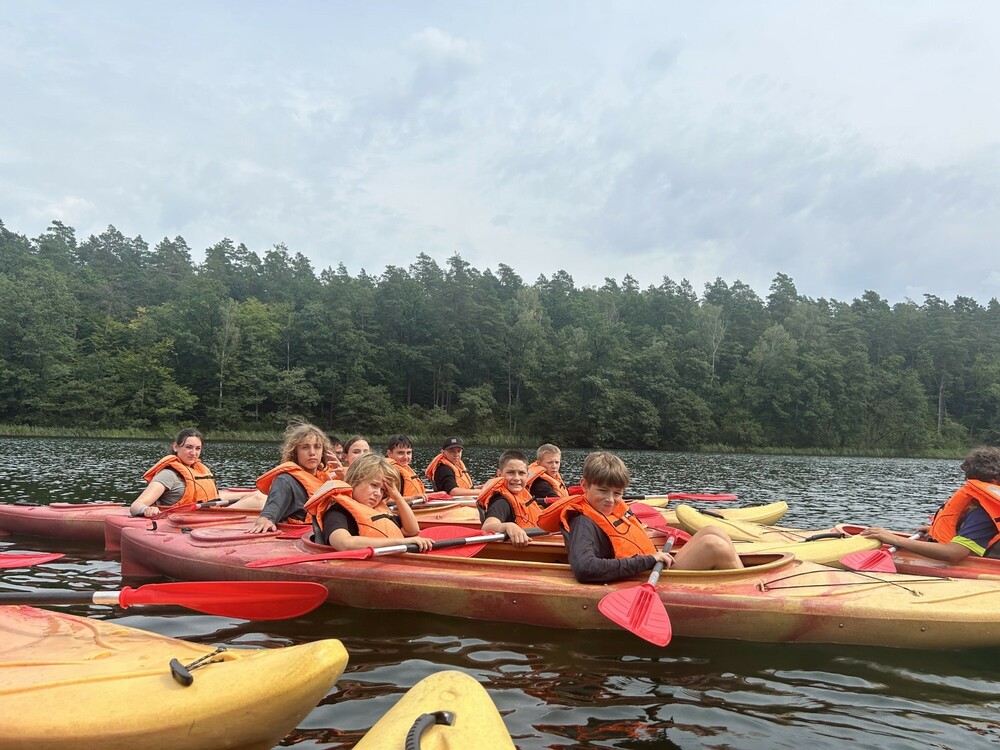 Za nami dzień pełen wrażeń! Po śniadaniu poznaliśmy budowę łuku i uczyliśmy się z niego strzelać. Następnie w Strefie UFO sprawdziliśmy swoją naukową wiedzę o Ziemi i Wszechświecie. Wyruszyliśmy też na wyprawę dwuosobowymi kajakami po pięknym jeziorze Łęsk. Dzięki zajęciom łącznościowym poznaliśmy alfabet Morse’a i zasady działania telefonów polowych. Dzień zakończyliśmy wspólną zabawą na dyskotece.