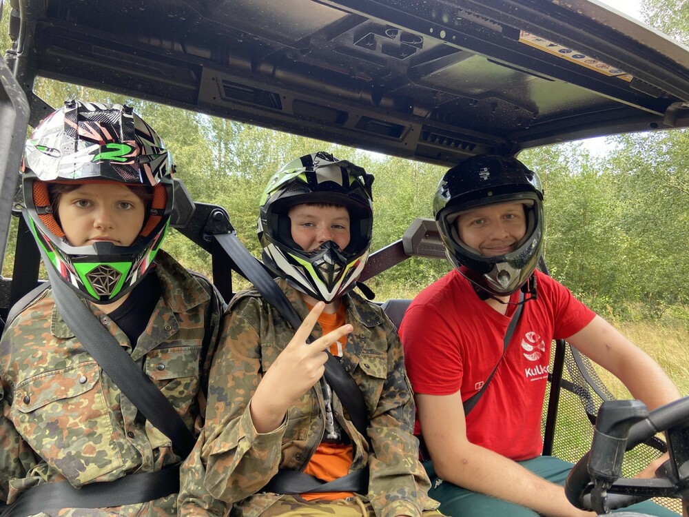 Niedzielę rozpoczęliśmy od wyprawy na poligon, na którym jeździliśmy quadami, rangerami i toczyliśmy się po torze w wielkiej dmuchanej kuli - zorbie. Byliśmy dziś również na plaży. Potem graliśmy w mega gry, takie jak na przykład twister, a także bawiliśmy się w śpiewające fortepiany.