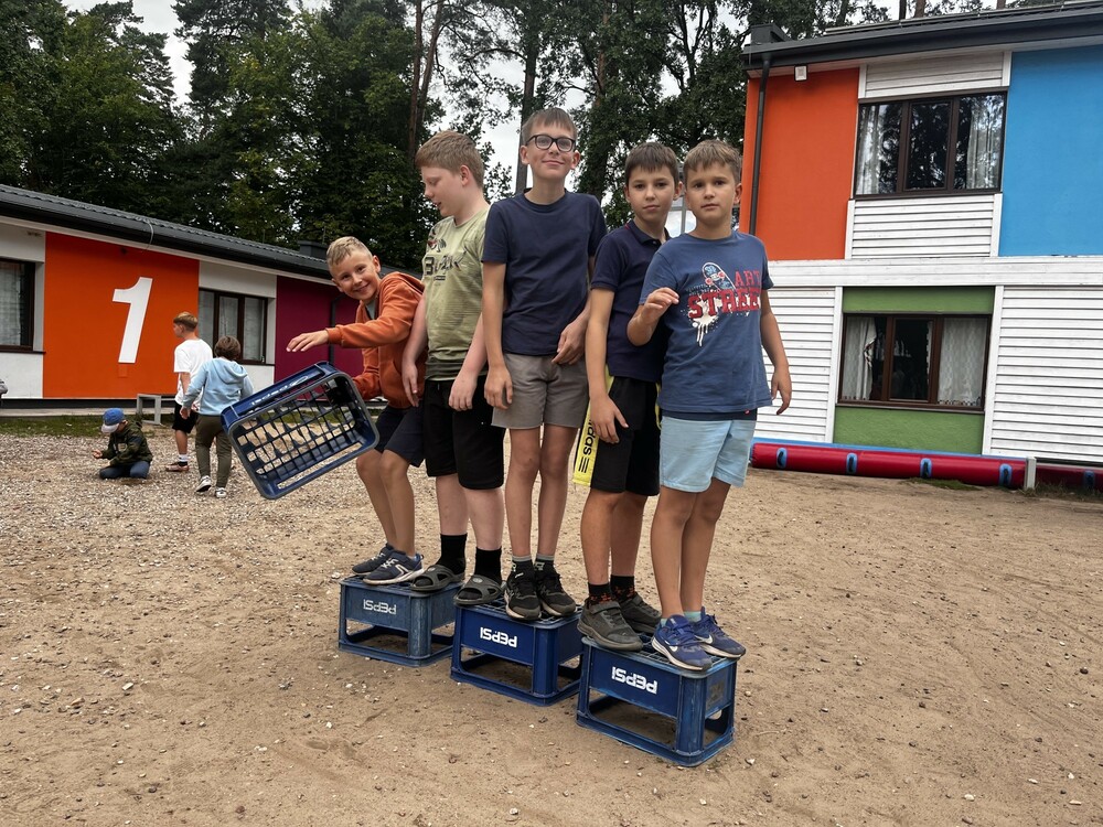 Dzień rozpoczęliśmy zabawami i grami integracyjnymi – były kamizelki kredowe, trójlina, chodzenie po skrzynkach, rurowce, taśmociąg. Potem odkryliśmy Strefę UFO, weszliśmy do spodka i wtajemniczyliśmy się w historię kosmicznych Mazur. Pokonywaliśmy też różne trasy na ściance wspinaczkowej o różnych poziomach trudności. Następnie układaliśmy wieżę ze skrzynek, na którą jednocześnie się wspinaliśmy. Wybraliśmy się również na wyprawę kajakami jednoosobowymi po jeziorze Łęsk.