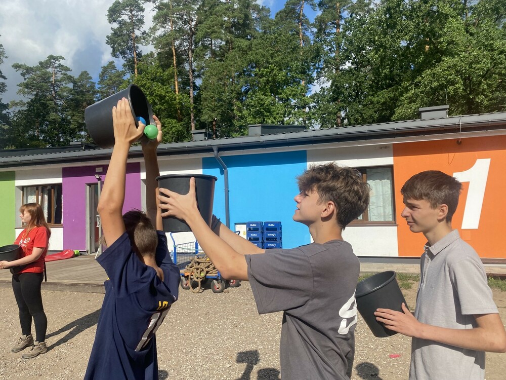 Dziś rano uczyliśmy się strzelać z wiatrówek i rozegraliśmy turniej strzelecki. Następnie wcieliliśmy się w wojowników sumo i walczyliśmy w specjalnych strojach na macie. Później malowaliśmy obrazy na folii rozciągniętej między drzewami. Po pysznym obiedzie udaliśmy się na plażę i skorzystaliśmy z kąpieli w jeziorze Łęsk. Następnie zrobiliśmy sobie plenerowy seans filmowy. Wieczorem powstała nasza flaga kolonijna.