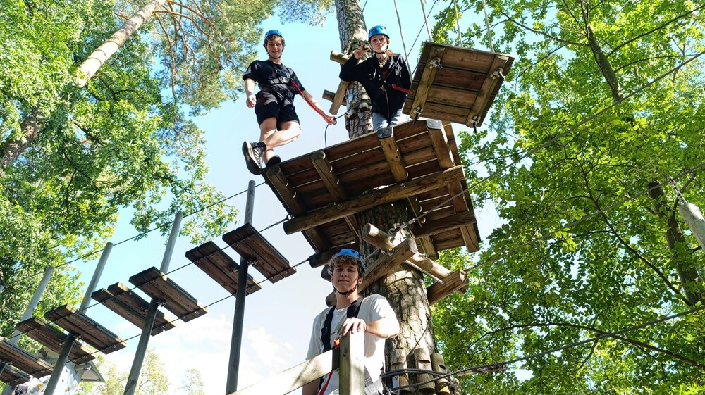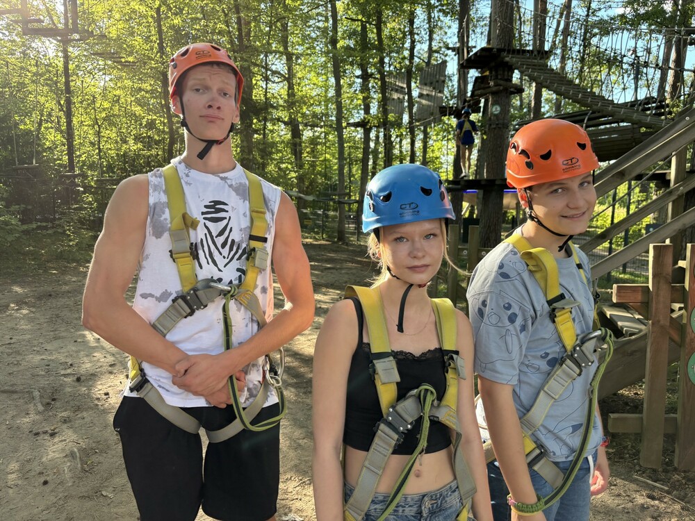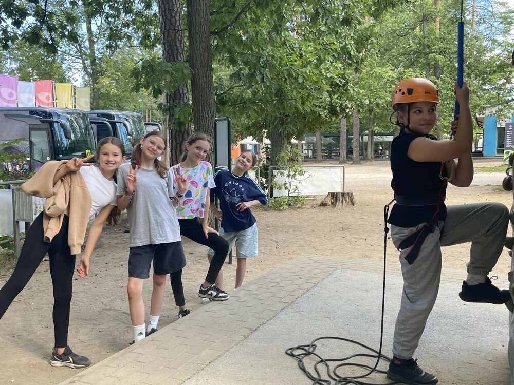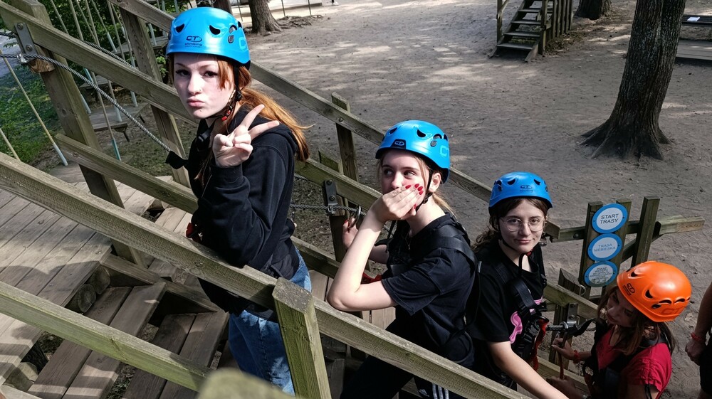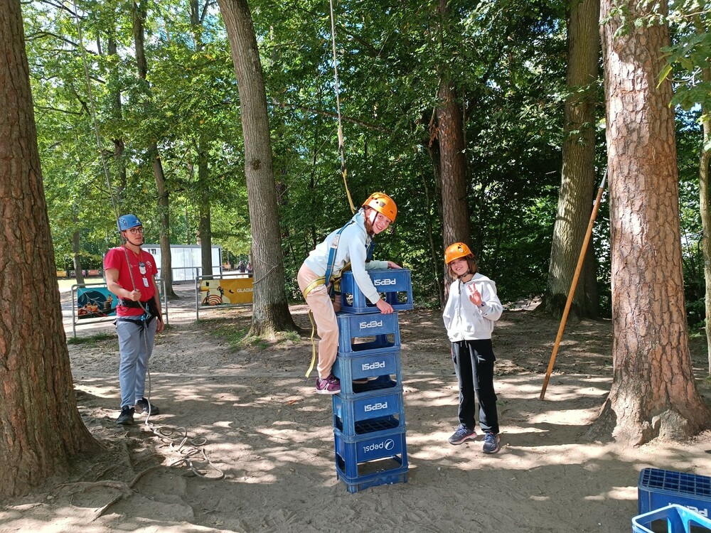 Dzień rozpoczęliśmy od wspólnego spędzania czasu na świeżym powietrzu, po czym udaliśmy się na plażę, na której graliśmy w siatkówkę oraz kąpaliśmy się w jeziorze. Następnie pokonywaliśmy dwie trasy parku linowego. Każdemu z nas udało się przejść najwyższy tor! Jesteśmy z siebie bardzo dumni. Po świetnej zabawie na świeżym powietrzu przyszedł czas na pojedynki gladiatorów, na których było dużo rywalizacji oraz śmiechu. Z niecierpliwością czekamy na jeszcze jeden dzień pełen pozytywnych emocji.