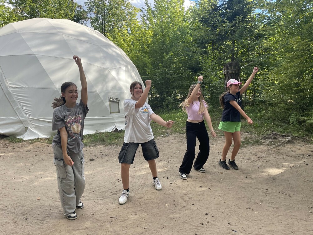 Kolejny dzień rozpoczęliśmy od seansu w kinie sferycznym. Obejrzeliśmy film w technologii 3D na temat historii lotnictwa. Graliśmy dziś też w siatkówkę oraz koszykówkę. Tradycyjnie rozegraliśmy również partyjkę naszej ulubionej gry karcianej, czyli UNO. Poznaliśmy ciekawostki na temat survivalu i budowaliśmy schronienie z pałatki wojskowej. Wyszły nam naprawdę solidne szałasy. Na zakończenie dnia przed kolacją wypłynęliśmy na wyprawę rowerkami wodnymi po jeziorze Łęsk.