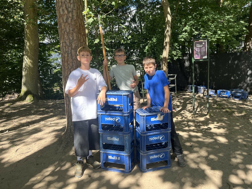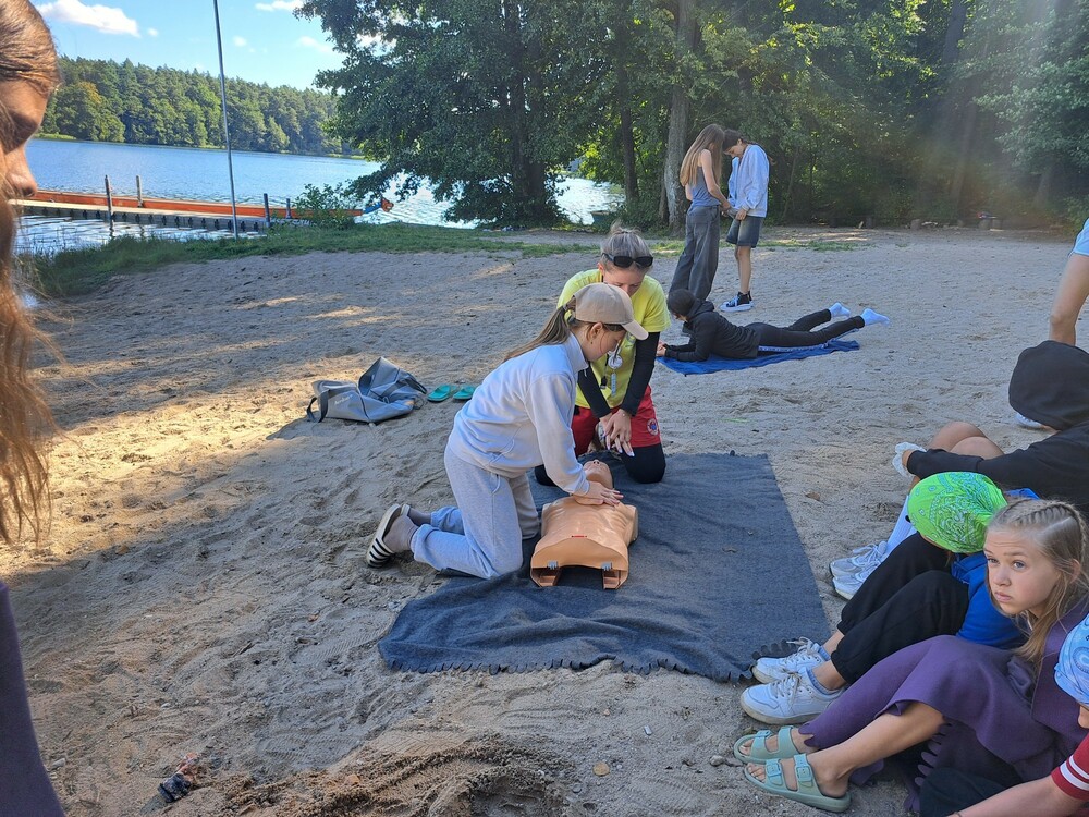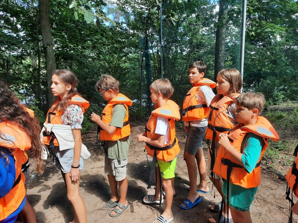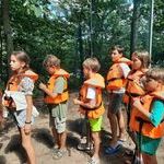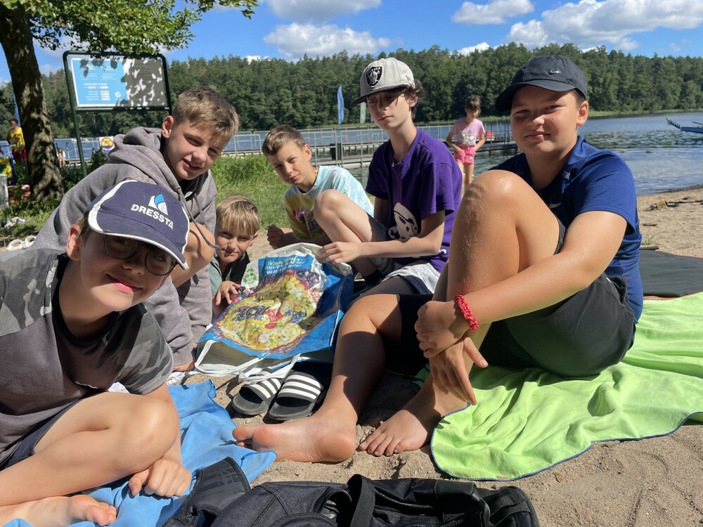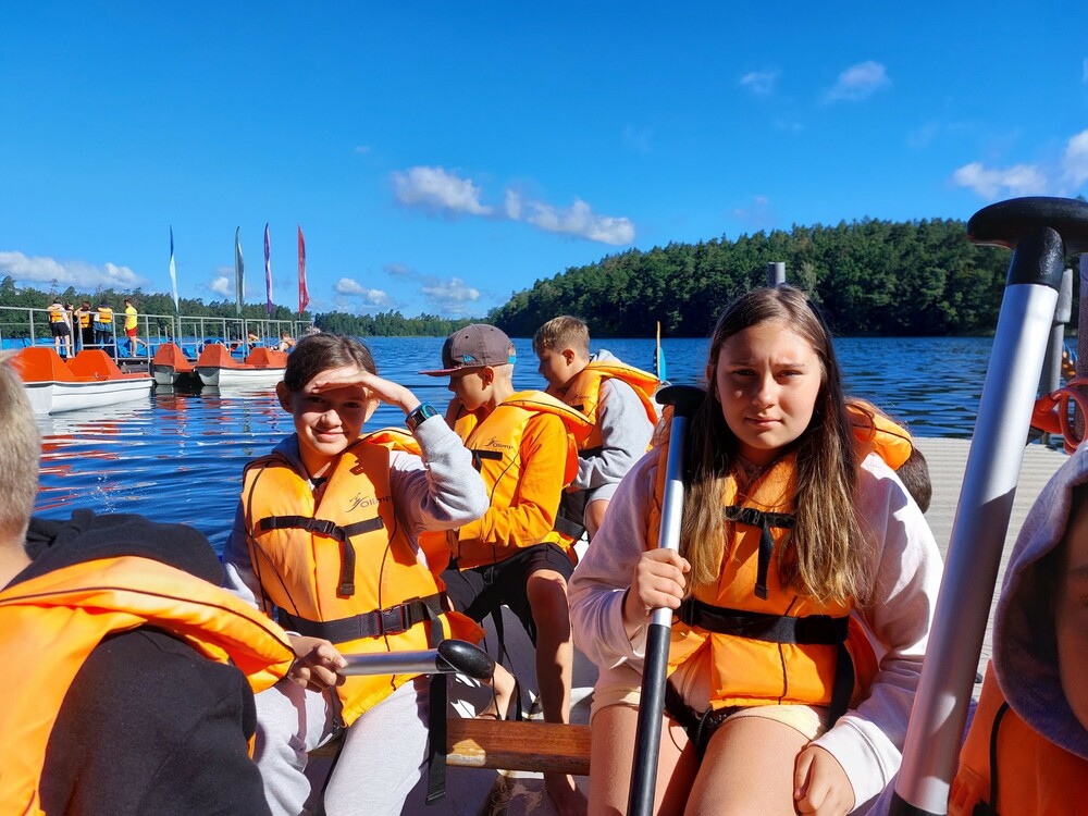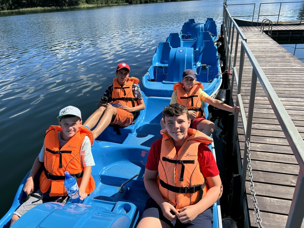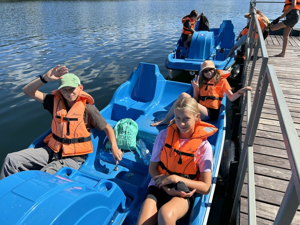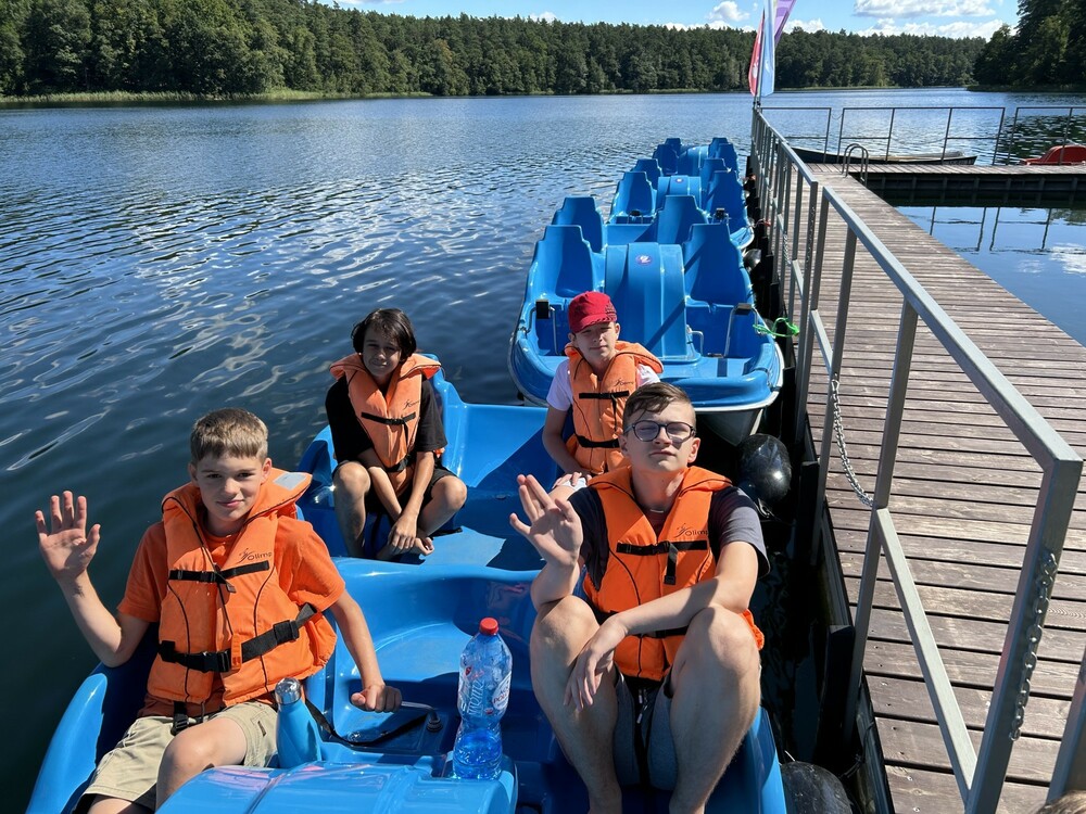 Dzień zaczęliśmy od wspinania się na wieżę ze skrzynek, niektórym z nas udało się ułożyć aż trzynaście skrzynek i pobić rekord dnia. Potem wyruszyliśmy na wyprawę rowerami wodnymi po jeziorze Łęsk, było bardzo miło płynąć w taką piękną pogodę. Udaliśmy się też do lasu na zajęcia z survivalu, dowiedzieliśmy się czym jest sztuka przetrwania oraz jakie są jej rodzaje, z czego składa się puszka survivalowa, budowaliśmy też prowizoryczne schronienie. To był dzień pełen atrakcji!