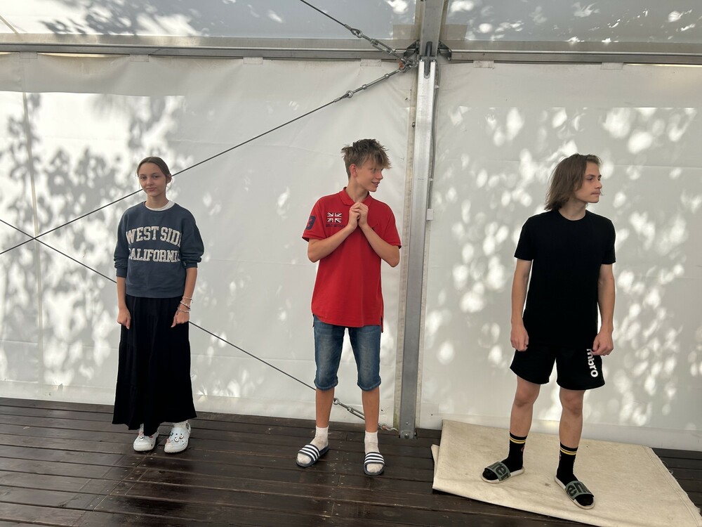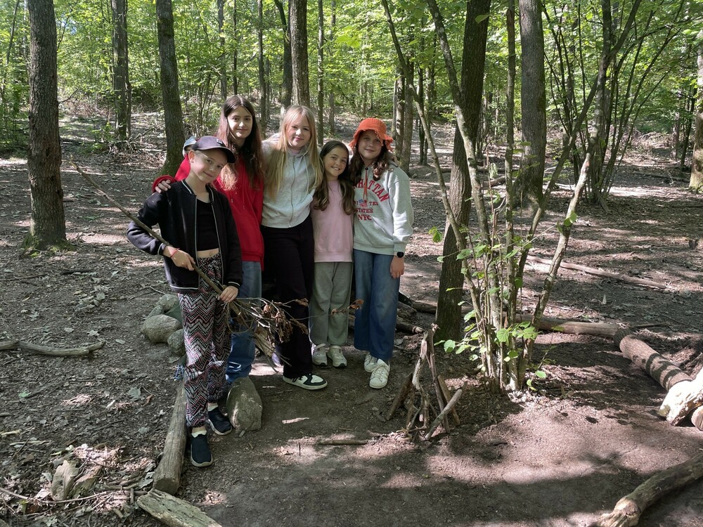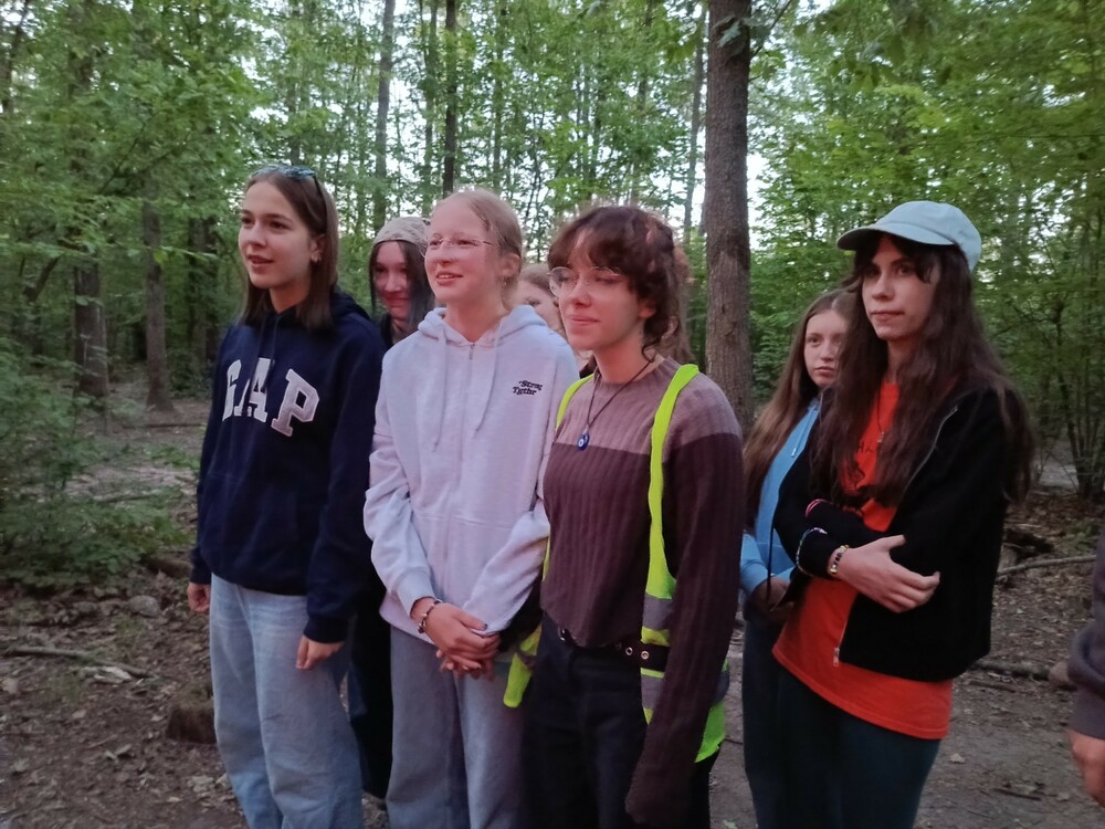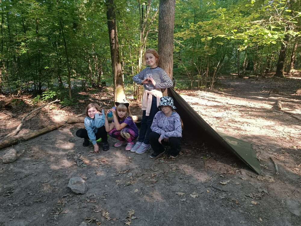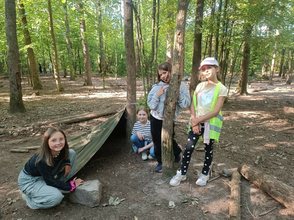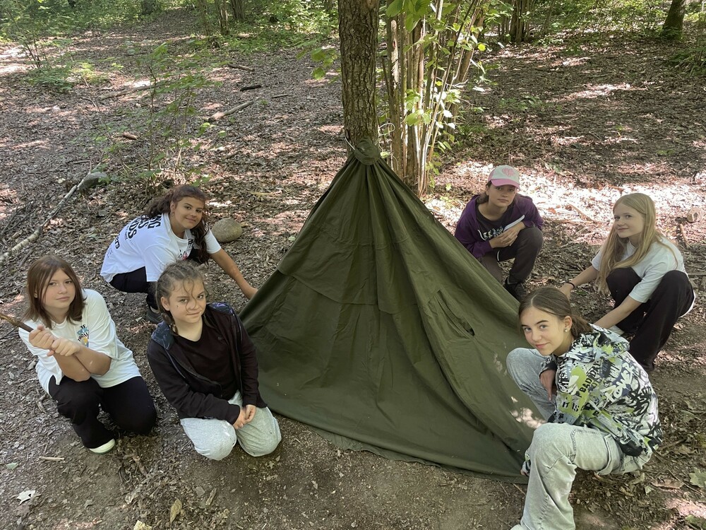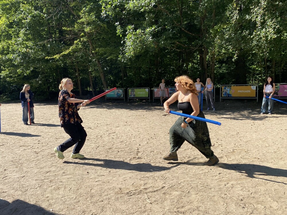Nasz dzień był pełen emocji i wyzwań. Zaczęliśmy od walk gladiatorów, podczas których stoczyliśmy pojedynki, używając dużych lanc, rywalizując ze sobą. Następnie przenieśliśmy się do świata mega gier, gdzie bawiliśmy się w rozmiarze XXL, grając w gigantyczne wersje jengi, twistera i bierek. Kolejnym punktem programu było malowanie flagi naszej grupy, co pozwoliło nam wspólnie wyrazić naszą kreatywność i zacieśnić więzi. Na zakończenie dnia, w ramach zajęć survivalowych, uczyliśmy się podstaw przetrwania – budowaliśmy szałasy i ogniska, ucząc się radzenia sobie w trudnych warunkach.