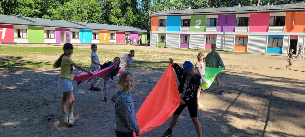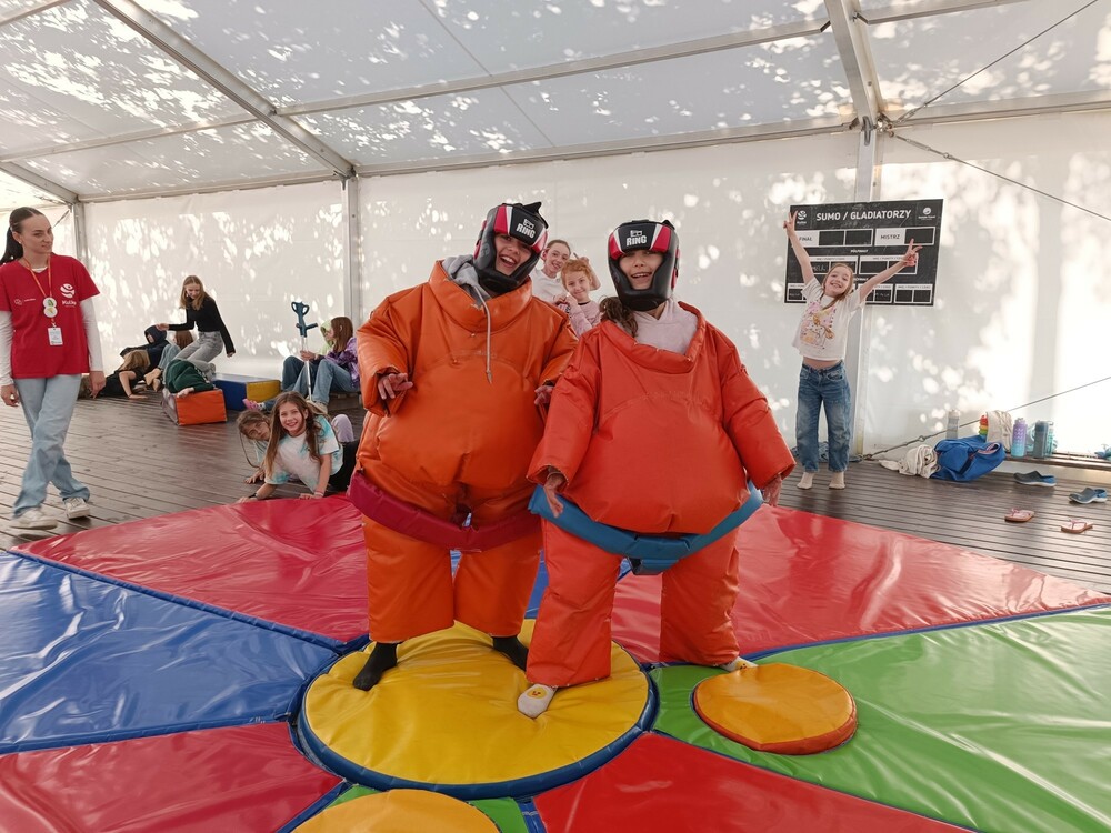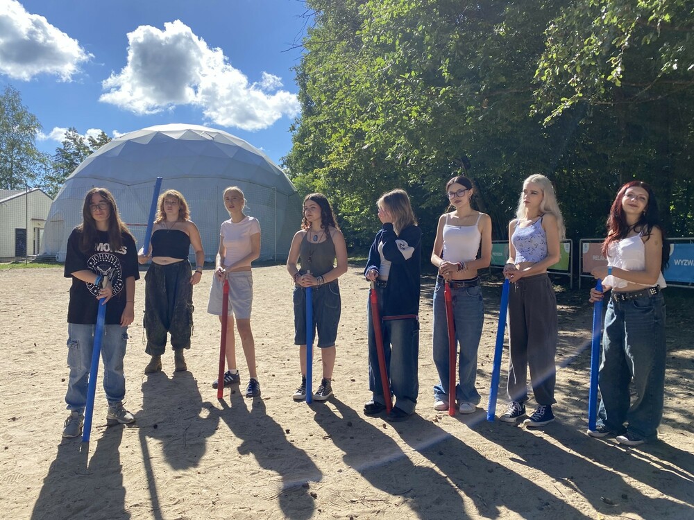 Kolejny ekscytujący dzień naszych kolonii rozpoczęłyśmy od rywalizacji na specjalnej macie - ubrane w zabawne i bezpieczne stroje oraz kaski ochronne próbowałyśmy przewrócić przeciwniczkę na matę. Później korzystając z pogody poszłyśmy na plażę, aby się popluskać w wodzie. Następnie ubrane w specjalną uprząż układaliśmy wieżę ze skrzynek, jednocześnie się na nią wspominając. Poszło nam świetnie! Po obiedzie udałyśmy się do lasu, aby poznać podstawy survivalu i jego rodzaje. Nauczyłyśmy się również budować schronienie przy użyciu wojskowej pałatki. Dzień zakończyłyśmy imprezą na Poziomie X.