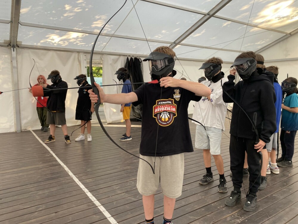 Nasz obozowy dzień zaczęliśmy od zajęć z łucznictwa, podczas których w parach mieliśmy konkurs strzelania do tarczy. Następnie udaliśmy się poza teren ośrodka ćwiczyć taktykę i strategię. Po powrocie mieliśmy zajęcia plastyczne z robienia przypinek. Po południu udaliśmy się na Letni Trójbój Obronny, podczas którego biegliśmy ze skrzynią, rzucaliśmy granatem oraz czołgaliśmy się. Następnie popłynęliśmy kajakami na drugi koniec jeziora, a dzień zakończyliśmy grą Nocny Desant. Zbieramy siły na jeszcze jeden dzień!