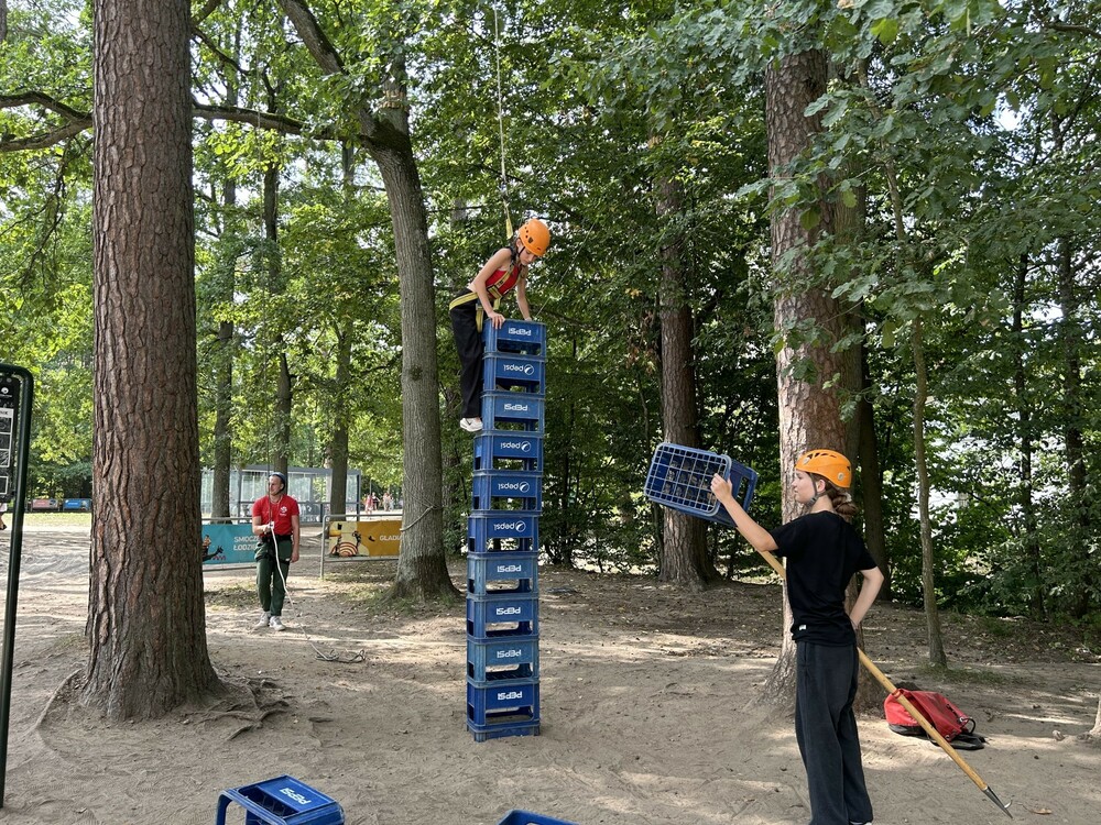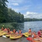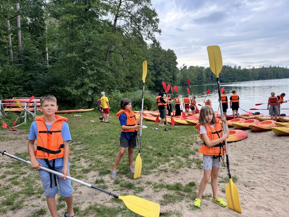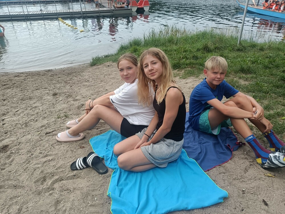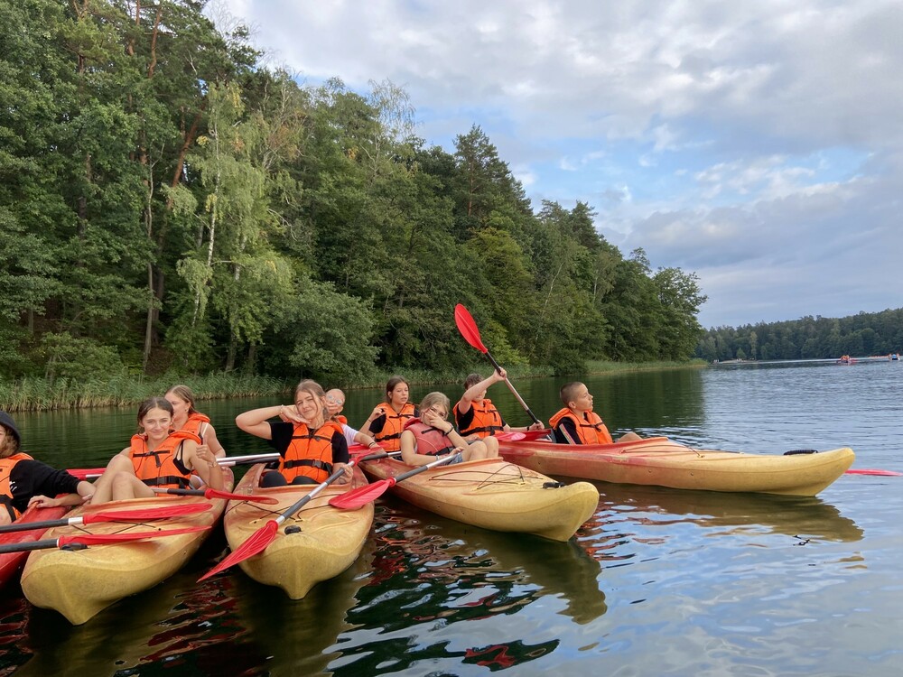 Dzisiaj z samego rana wyruszyliśmy na boisko piłki nożnej, aby rozegrać tam emocjonujący mecz. Następnie poszliśmy na plażę, na której odpoczywaliśmy pływając w jeziorze oraz opalając się na plaży. Później przyszedł czas na grę w różne planszówki, takie jak wirus lub jenga bum. Po obiedzie wspinaliśmy się na wieżę ze skrzynek, którą wcześniej sami zbudowaliśmy. Potem pływaliśmy na kajakach sit on top podziwiając przyrodę jeziora Łęsk. Na końcu dnia piekliśmy kiełbaski nad ogniskiem spędzając tam przyjemnie razem czas.