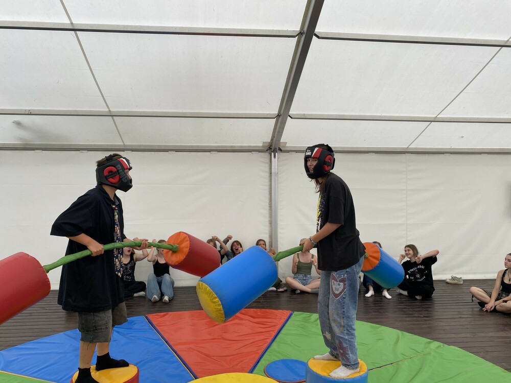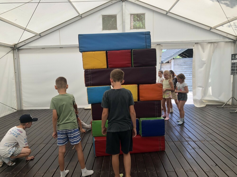Wtorek rozpoczęliśmy od zabaw ruchowych, takich jak murarz czy raz dwa trzy baba Jaga patrzy. Następnie graliśmy w jengę, twistera i inne gry w rozmiarze XXL. Znaleźliśmy też czas na plażowanie, podczas którego wypoczywaliśmy przed kolejnymi zajęciami. Graliśmy w pif paf. Przeszliśmy park linowy o dwóch poziomach trudności oraz tworzyliśmy własne przypinki.