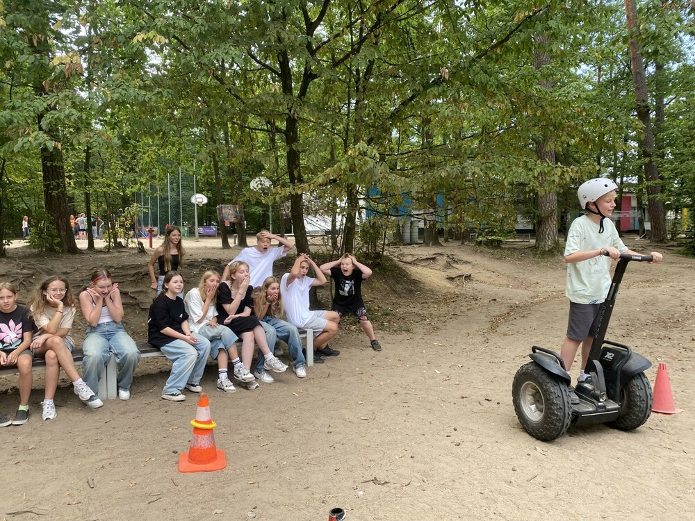 Dzień rozpoczęliśmy od zajęć, na których uczyliśmy się jeździć segwayem po specjalnym torze. Następnie przekroczyliśmy bramę tajnej Strefy UFO i weszliśmy do kokpitu spodka. Na kolejnych zajęciach udaliśmy na tor quadowy. Po obiedzie udaliśmy się na zajęcia łącznościowe, na których korzystając z telefonu polowego porozumiewaliśmy się między sobą. Tego dnia czekały nas też zajęcia, na których tworzyliśmy znaczki, które będą dla nas świetną pamiątką. Na koniec dnia udaliśmy się do Cool Clubu, gdzie graliśmy w różne interaktywne gry.
